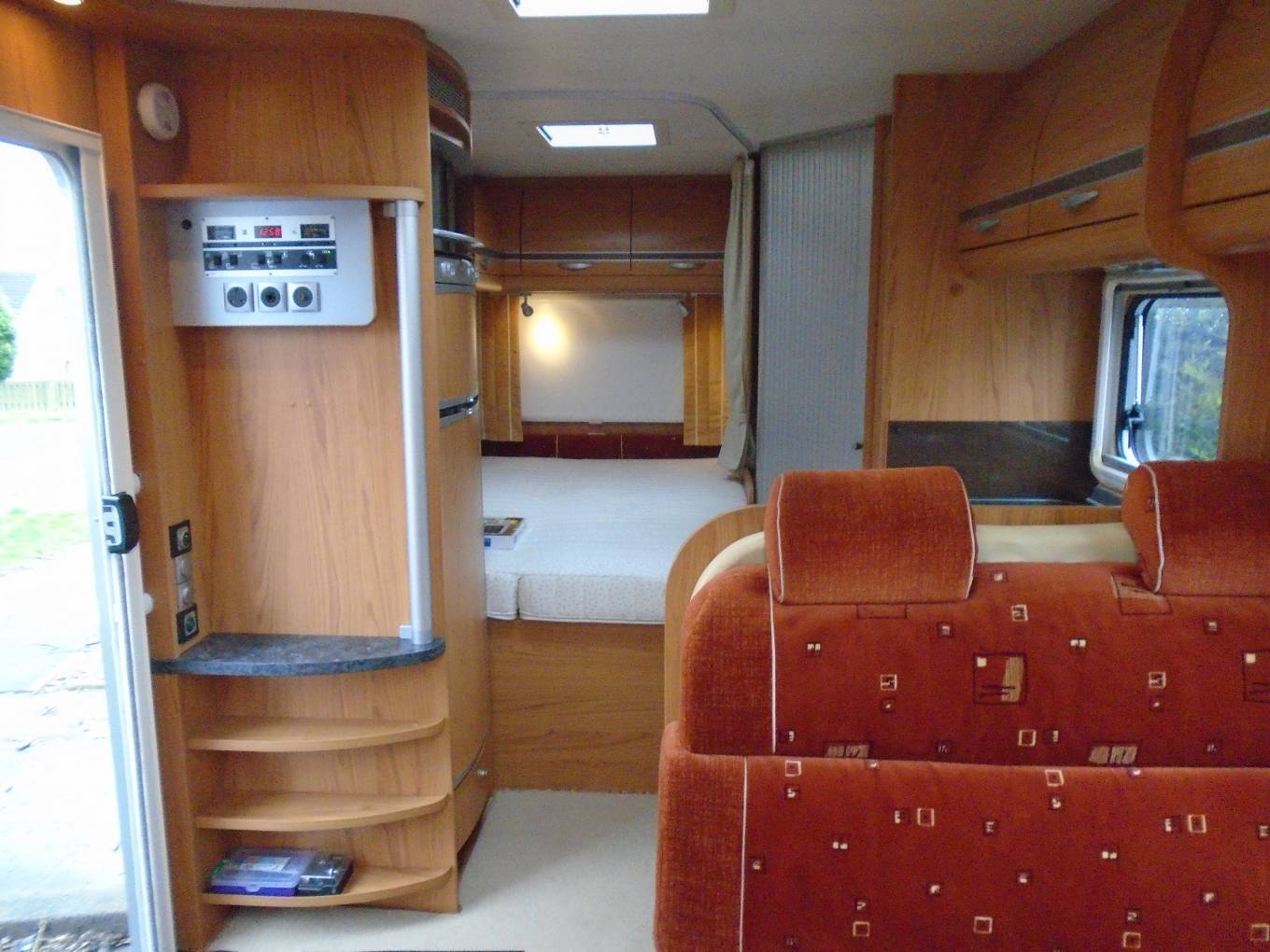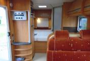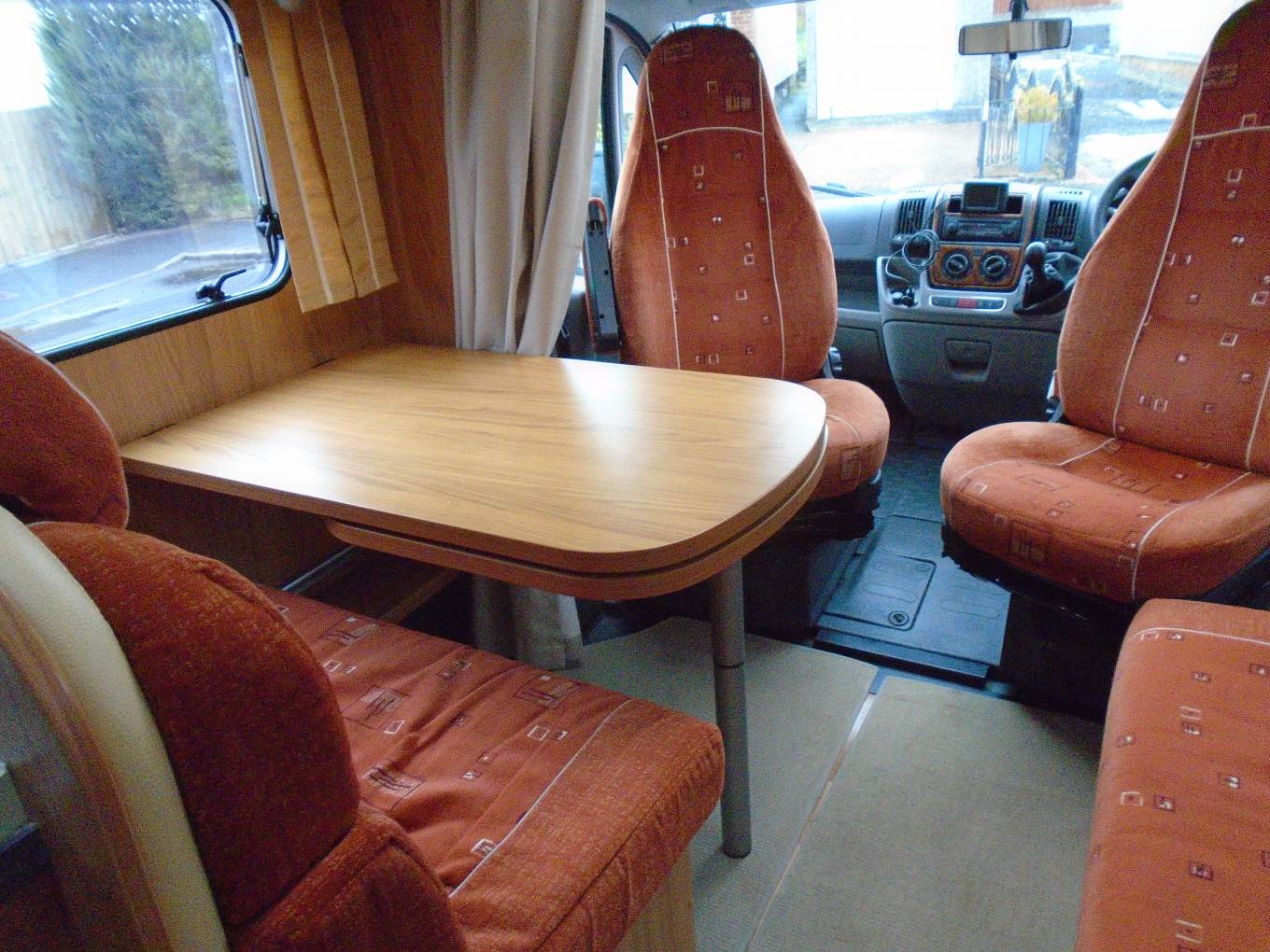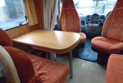 The chassis has a low step to enter . The dinette is situated just to the right of the habitation door it has a fixed table with extending leaf to join a side seat. The front drivers and passengers seats also swivel round to join this area which will then comfortably seat 5. The forward facing passenger seats also have 2 x 3 point seat belts for travelling passengers. The table will also drop down to make and additional bed for 1 to 2 people.