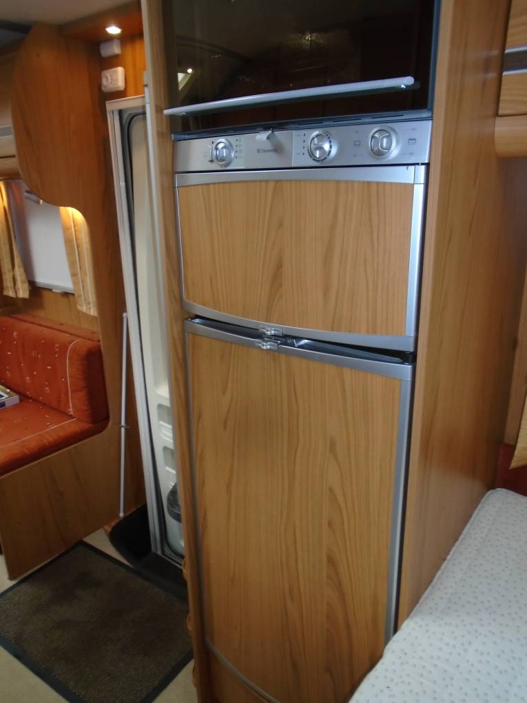 The Kitchen area is just behind and consists if an L shaped worktop incorporating a round brushed metal finish sink & seperate drainer with chrome mixer tap. A 3 Gas Burner Hob with ample drawer & cupboard space above and below. Opposite there is Dometic Tec Tower with an Oven & grill over a large fridge with separate freezer compartment, this is an absorber type and can be powered by 240v, 12v or gas depending whether your are plugged in on site or wild camping.