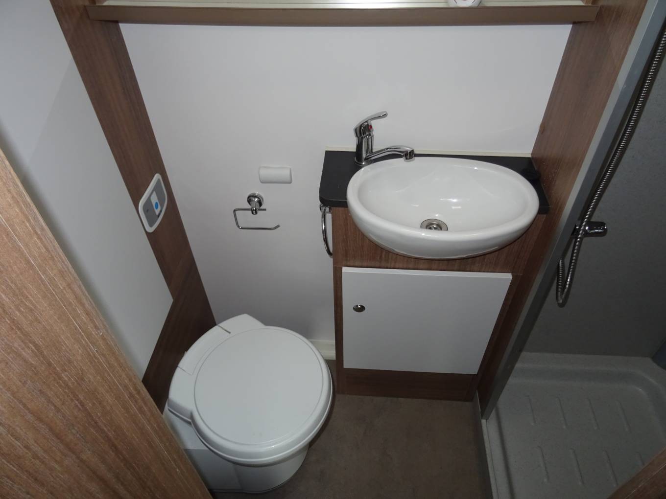 toilet, sink, separate shower and mirrors. This is a light & airy motorhome