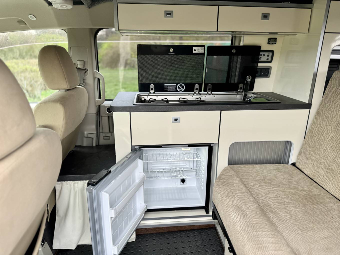 The kitchen features a 2 burner gas hob, sink with tap, 12v fridge and ample storage.