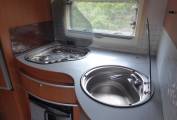 Conveniently adjacent to the dinette, there is a central kitchen with a combination oven/grill, a sink, a hob with three gas burners, an extractor fan, a fridge, and a separate freezer box.