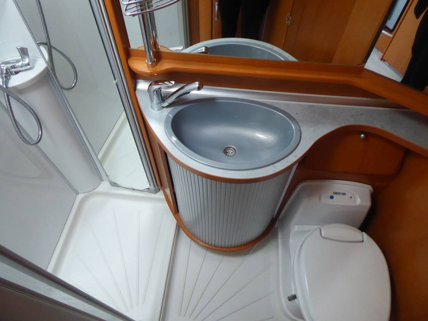 Opposite the kitchen is the bathroom, with a toilet, a hand basin, and a shower.