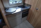The lounge area has a large extendable table and with the front seats swivelling to face the rear, there is adequate room for 6 people to sit comfortably around the table. At night time the large electric double bed is lowered over this area. Just behind the lounge is a well equipped kitchen area with hob, sink, microwave, oven/grill and large fridge freezer as well as plenty of head height lockers (throughout the vehicle) and drawers in the kitchen.