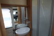 The washroom is at the rear of the vehicle and contains a large wardrobe with hanging rail, w.c. and sink/vanity unit and a separate shower cubicle.