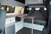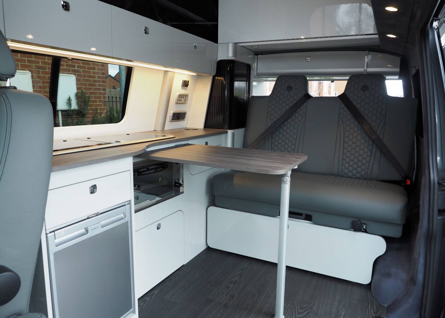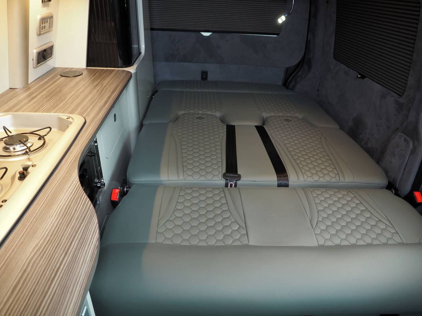 This unmarked campervan features high quality fixtures and fittings, leather upholstery, gas strut assisted rear rib seat bed, blinds to habitation windows, Webasto diesel heating, cold water system with onboard fresh water tank, gas hob and grill, full electrics with charging system, carpets.