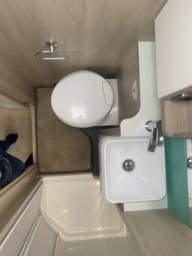 enclosed shower, sink/vanity storage and a toilet with removable toilet