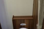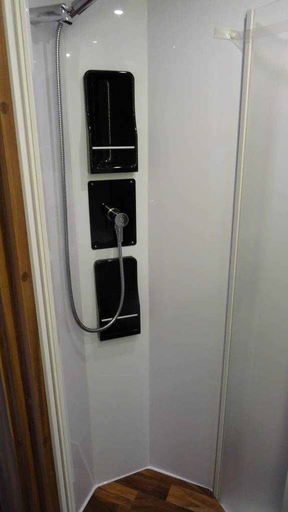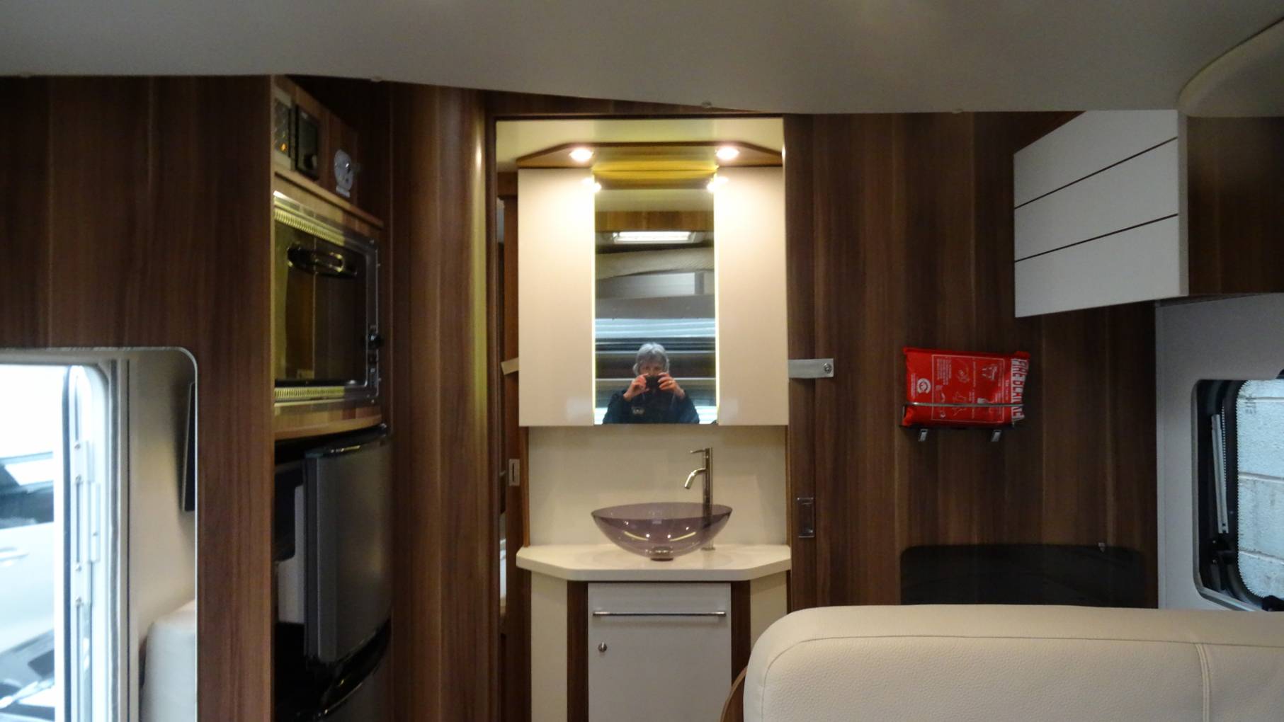 The habitation door is on the offside centre. On entering the large fridge and separate