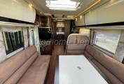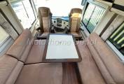 We enter the motorhome on the Drivers side, immediately to the right of the habitation door is a large two seater sofa, opposite is the dinette with an L shaped sofa the forward facing section having 2 x 3 point lap & diagonal seatbelts for travelling passengers. The table is fixed to the floor but can be moved in two axis to centralise. At night the table drops down to make a double bed. The front two seats rotate to join this area so you could easily seat 6 people if entertaining on site.