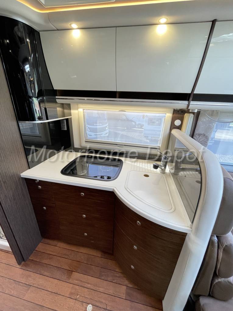 Large L shape kitchen with Kitchen upgrade package consisting of: White Corian style single piece kitchen worktop with seamlessly integrated sink with extendible chrome mixer tap, Thetford 3 burner gas hob. Opposite is a Dometic tech tower with Oven & grill over a 3 way 190 litre fridge which can be powered by 240v 12v or gas depending whether you are plugged in on site or wild camping. There is ample cupboard and drawer space for all you cooking utensils.