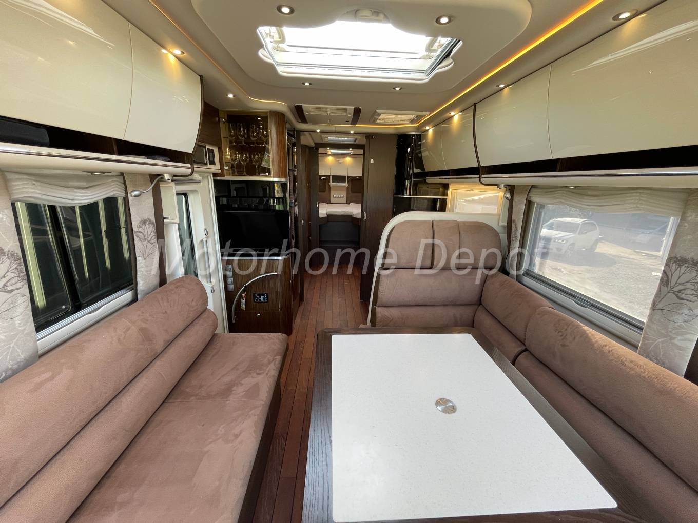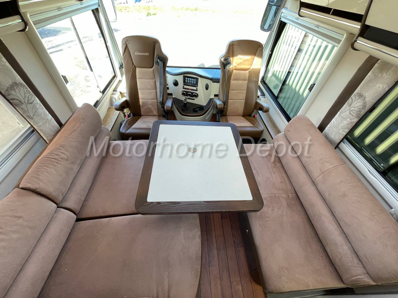 A rare opportunity to purchase one of the finest motorhomes that money can buy, Concordes Charisma 850 L Jubilee Edition. Registered in 04/15 with only 3 owners from new and having only covered 30K miles. Based on the ever popular Iveco 70C21 chassis, with Euro 5 emissions this 3.0 diesel engine develops 205 bhp, with the ZF automatic gearbox. The Cab benefits from; Blaupunkt multimedia head unit with truck software and 7.0” touchscreen, integrated radio with DVD, CD and MP3 playback, Bluetooth for telephone hands free & streaming; Reverse camera screen with two views; 120L fuel tank; 16” Golsdschmitt alloy wheels to front & with matching rear trims and widened spur to front; Concorde leather removeable steering wheel; climate control air conditioning; ASR; Cruise control; Black Leather trimmed dashboard; Electrically adjustable multi angle coach style mirrors; Coach wipers, Electrically operated 240 volt drop down metal insulated cab front screen blind, Blinds to side windows, Privacy front screen (variable screening from inquisitive eyes, in up ward direction),
