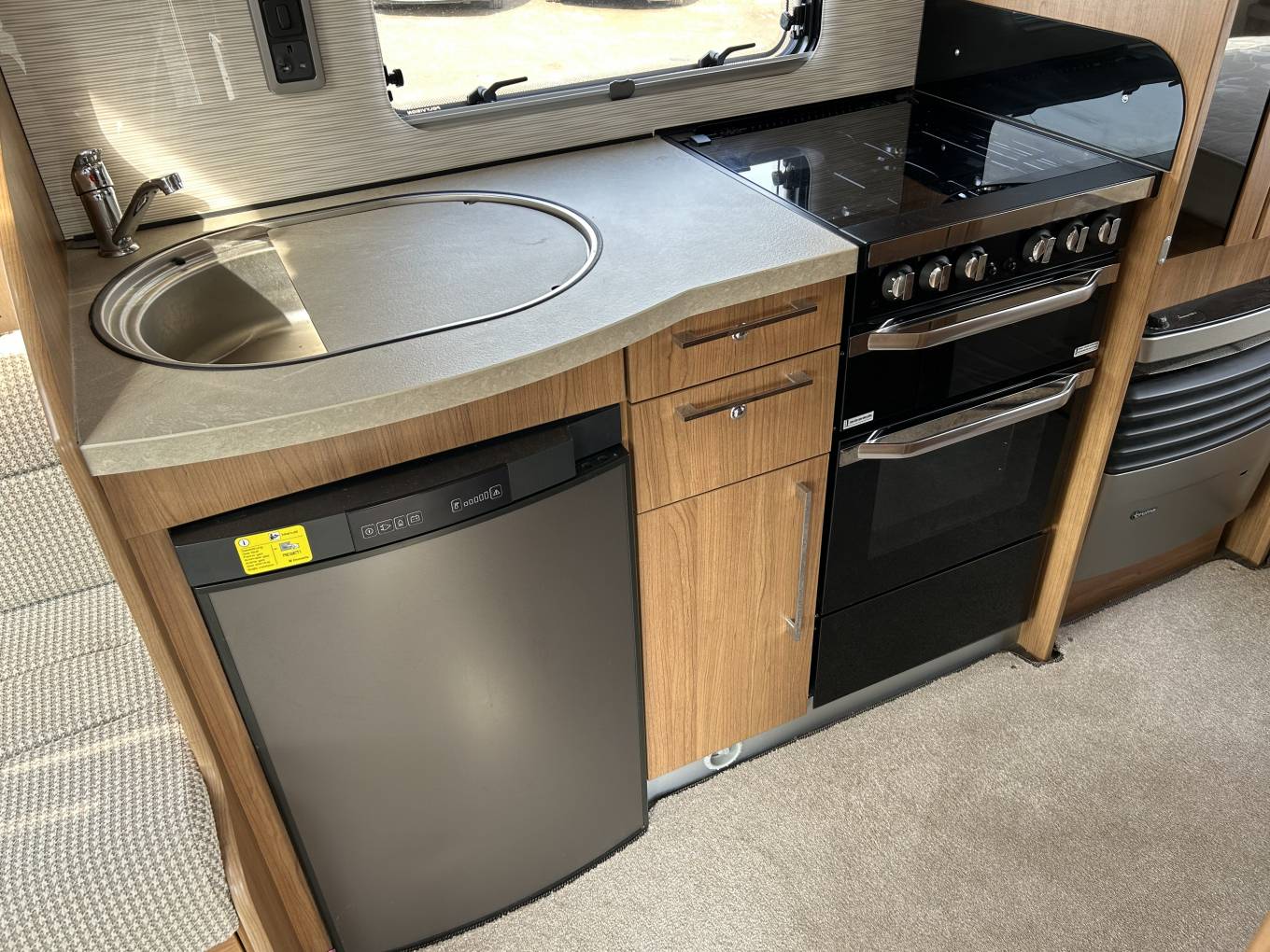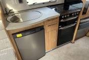 The mid-kitchen is well equipped and has all the facilities you need to rustle up great food on the go. You have a gas oven and grill, a dual-fuel hob with an electric hotplate and 3 gas burners as well as a microwave. The fridge freezer is a decent size and is big enough to store a fair amount of food and drink.