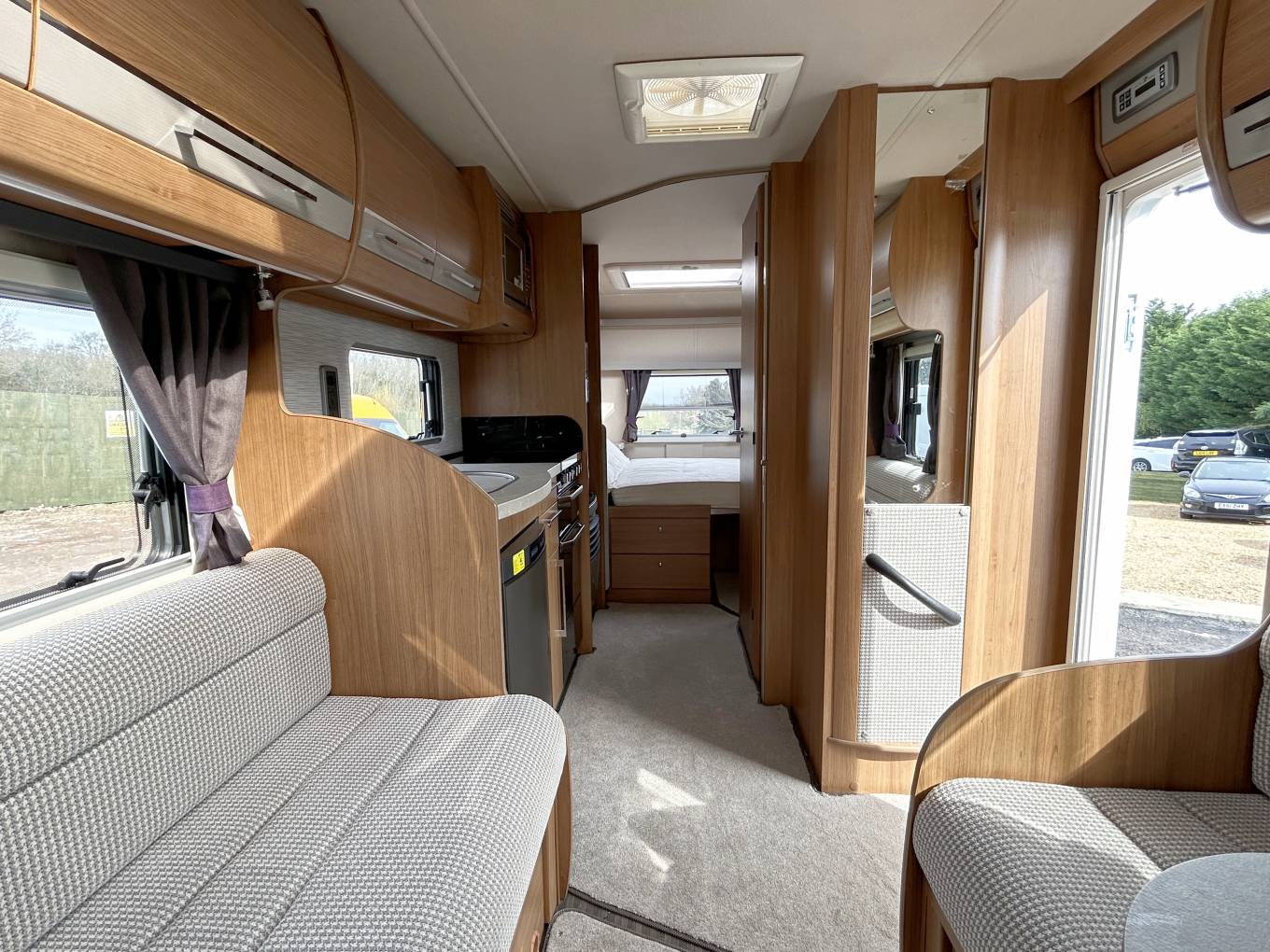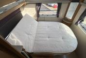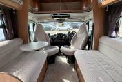 Behind the cab is the lovely lounge which is perfect for relaxing after a day out. Here you have two side facing sofas finished in a very elegant fabric. Put up the freestanding dining table, swivel the 2 front seats around and up to 6 people can enjoy meals together or play games. At bedtime the sofas pull together to create a double bed.