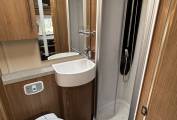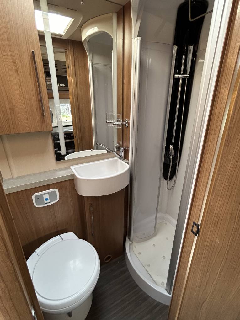 On the opposite side is the bathroom which has a separate shower with a Perspex screen, a Thetford cassette toilet with electric flush, a wash basin and mixer tap and a bathroom cabinet for your toiletries.