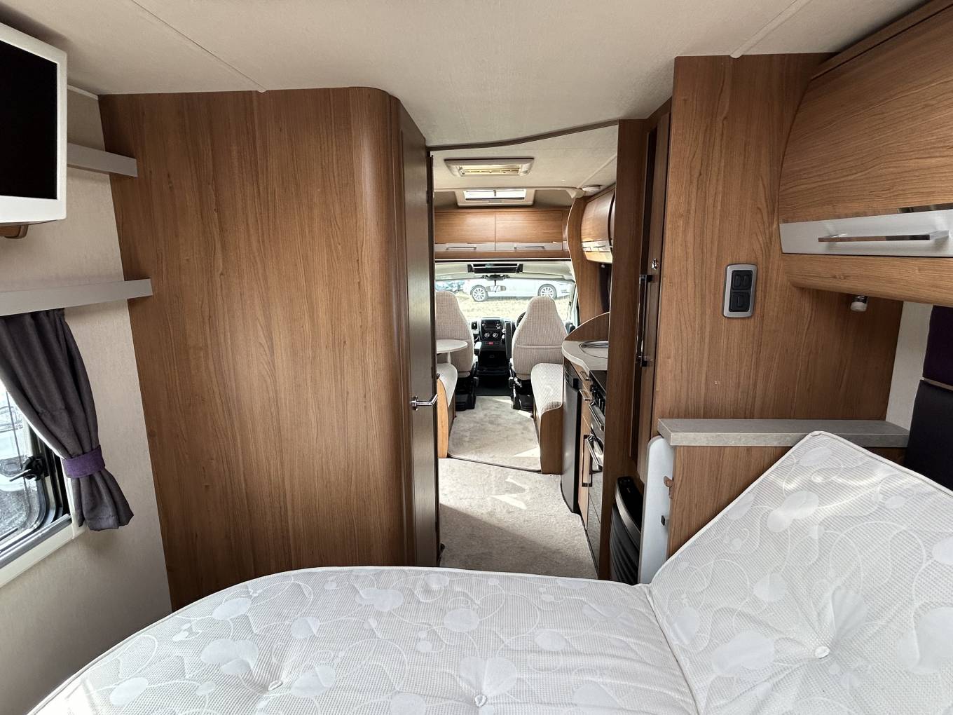 The rear bedroom features one of the standout features of this stunning motorhome and that is a transverse island bed so if one of you needs to use the bathroom during the night you don't have to climb over each other. There is a TV on a bracket, plenty of storage space in the overhead lockers and a large skylight throws in plenty of light during the day.