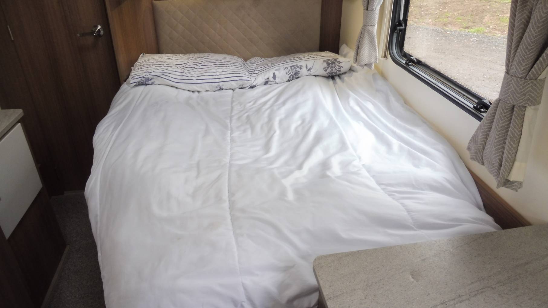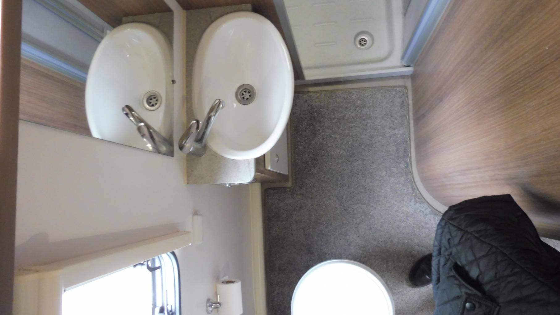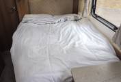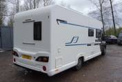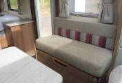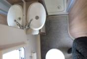 Behind the kitchen area is the French bed and at the rear is the full-width washroom, complete with Thetford cassette toilet, wash basin with mixer tap, storage lockers and a separate shower compartment.