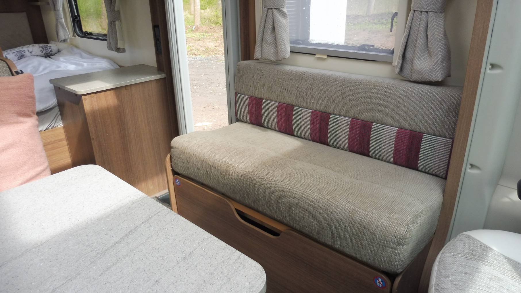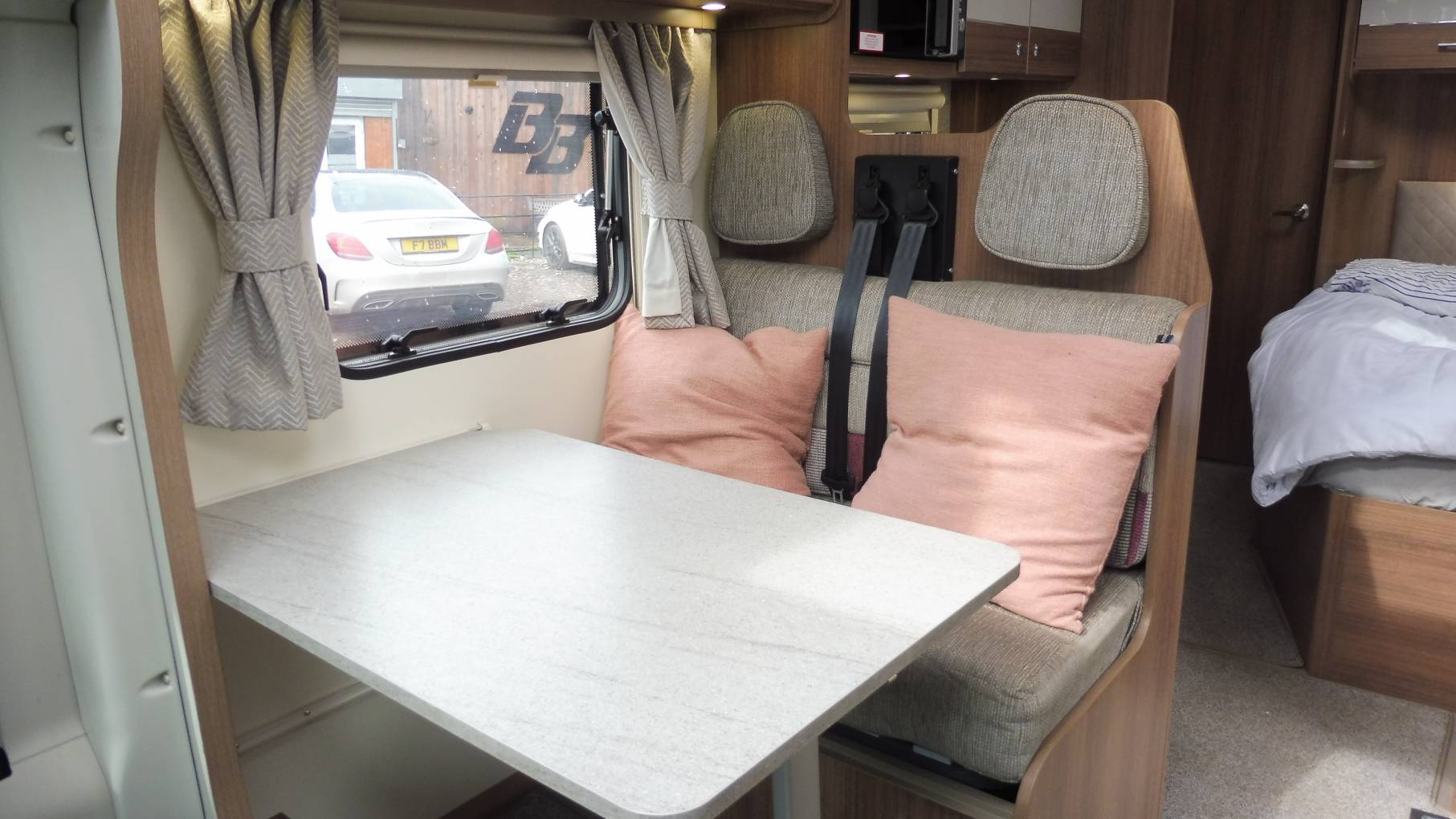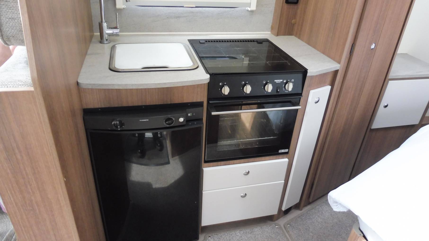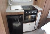 As you step into the motorhome, the kitchen area is directly in front of you. Complete with a 3-burner hob, combined grill / oven, 3-way under-counter fridge with removable freezer compartment, 800w microwave, stainless-steel sink with mixer tap.