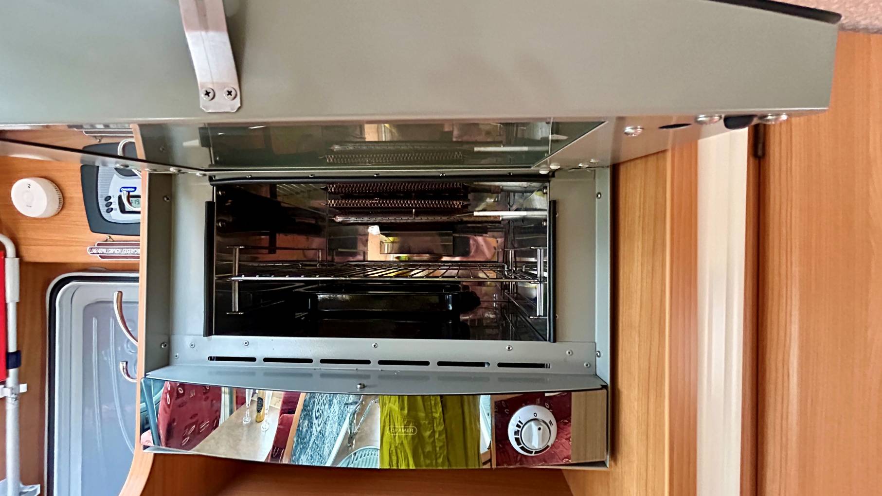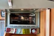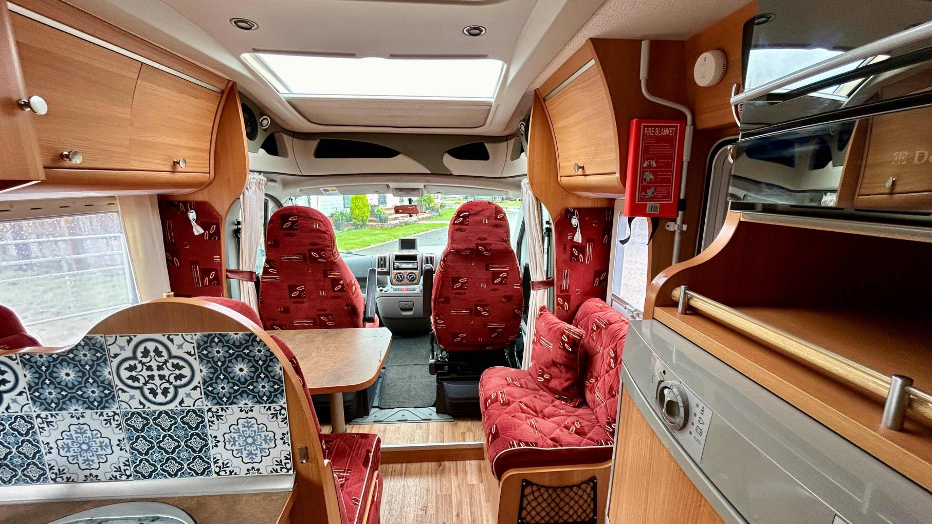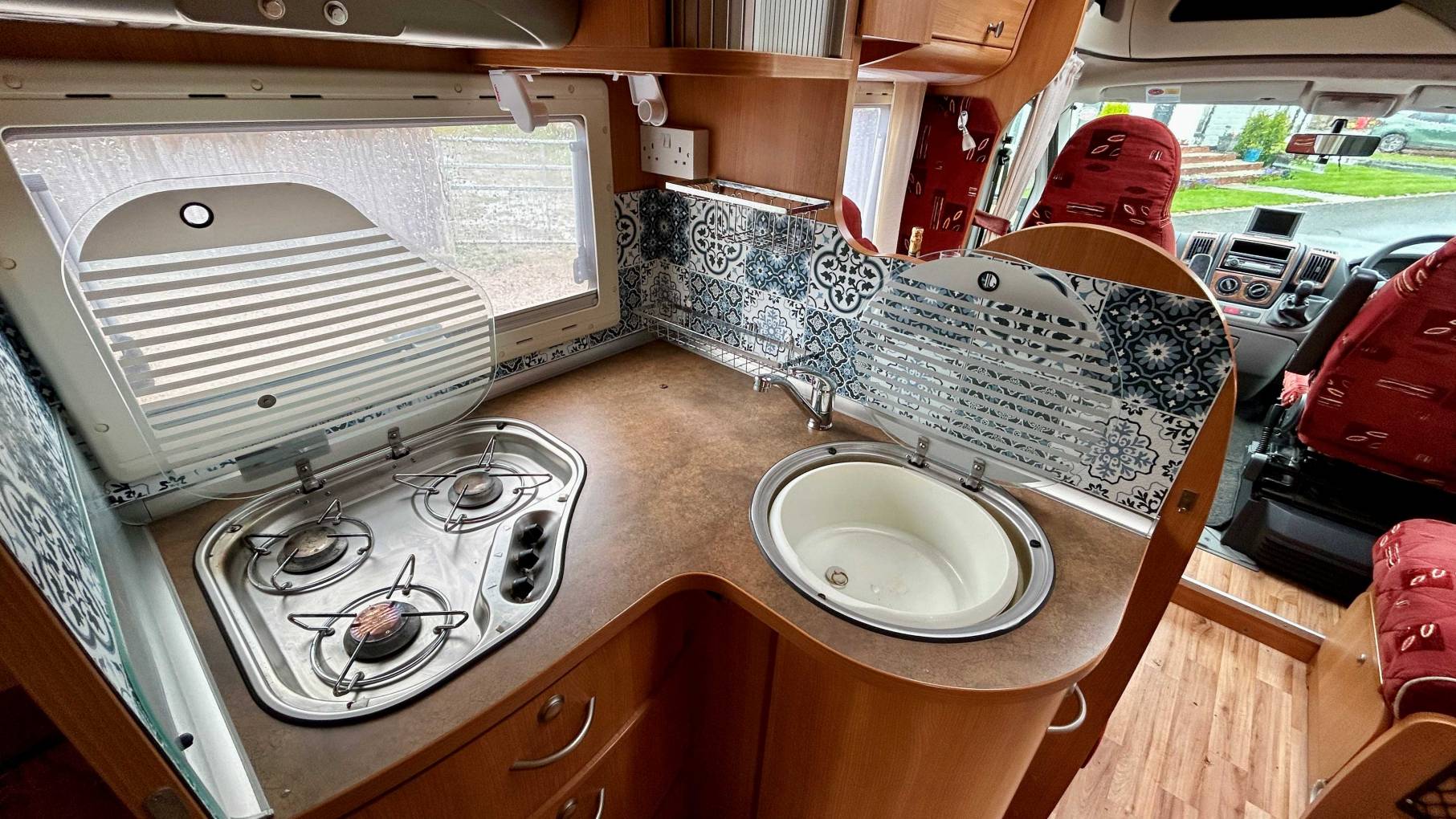 The mid-kitchen is well-equipped with a 3-burner hob, sink, Dometic combination oven/grill, and a generous 175L fridge-freezer.