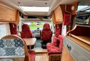 Up front, the lounge area includes a two-seater belted bench, a side bench, and swivelling cab seats, creating a versatile living space. The seating converts into an additional single bed for extra sleeping arrangements.