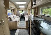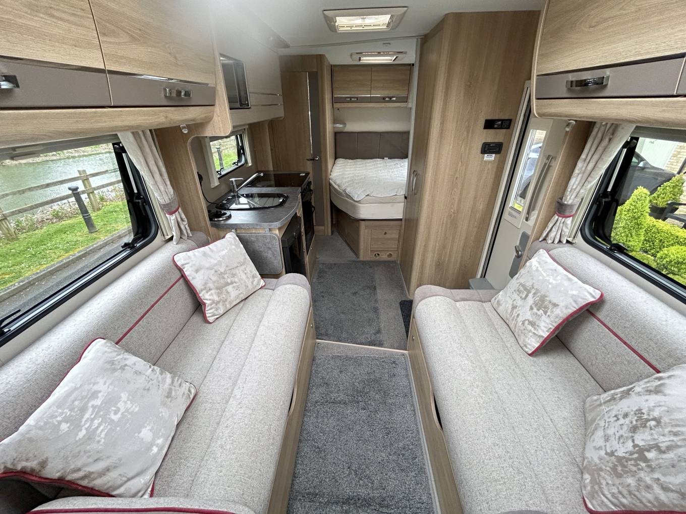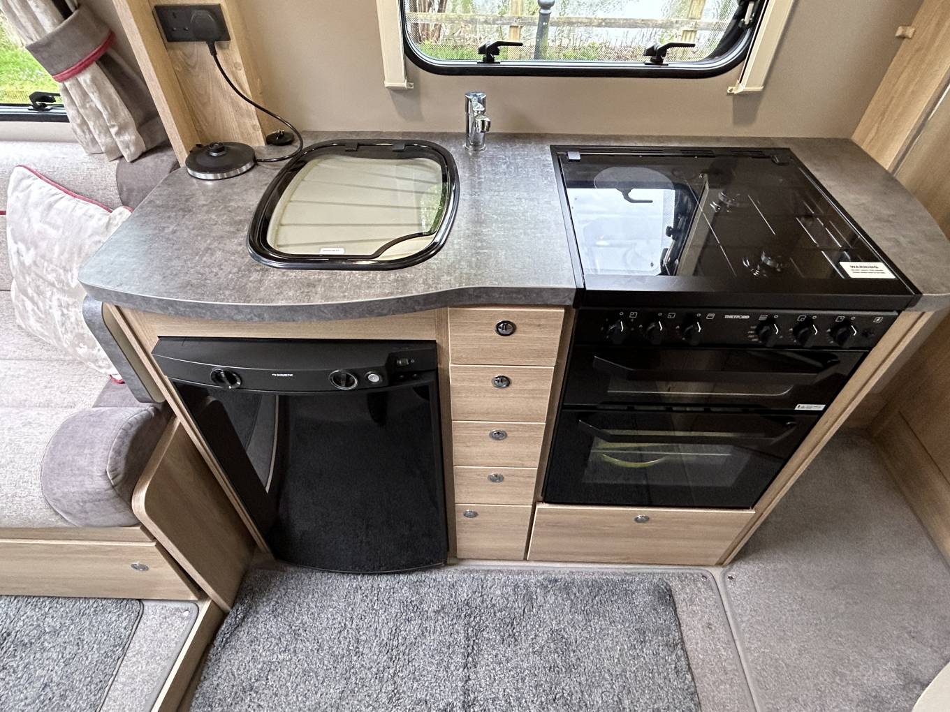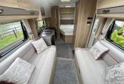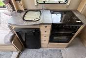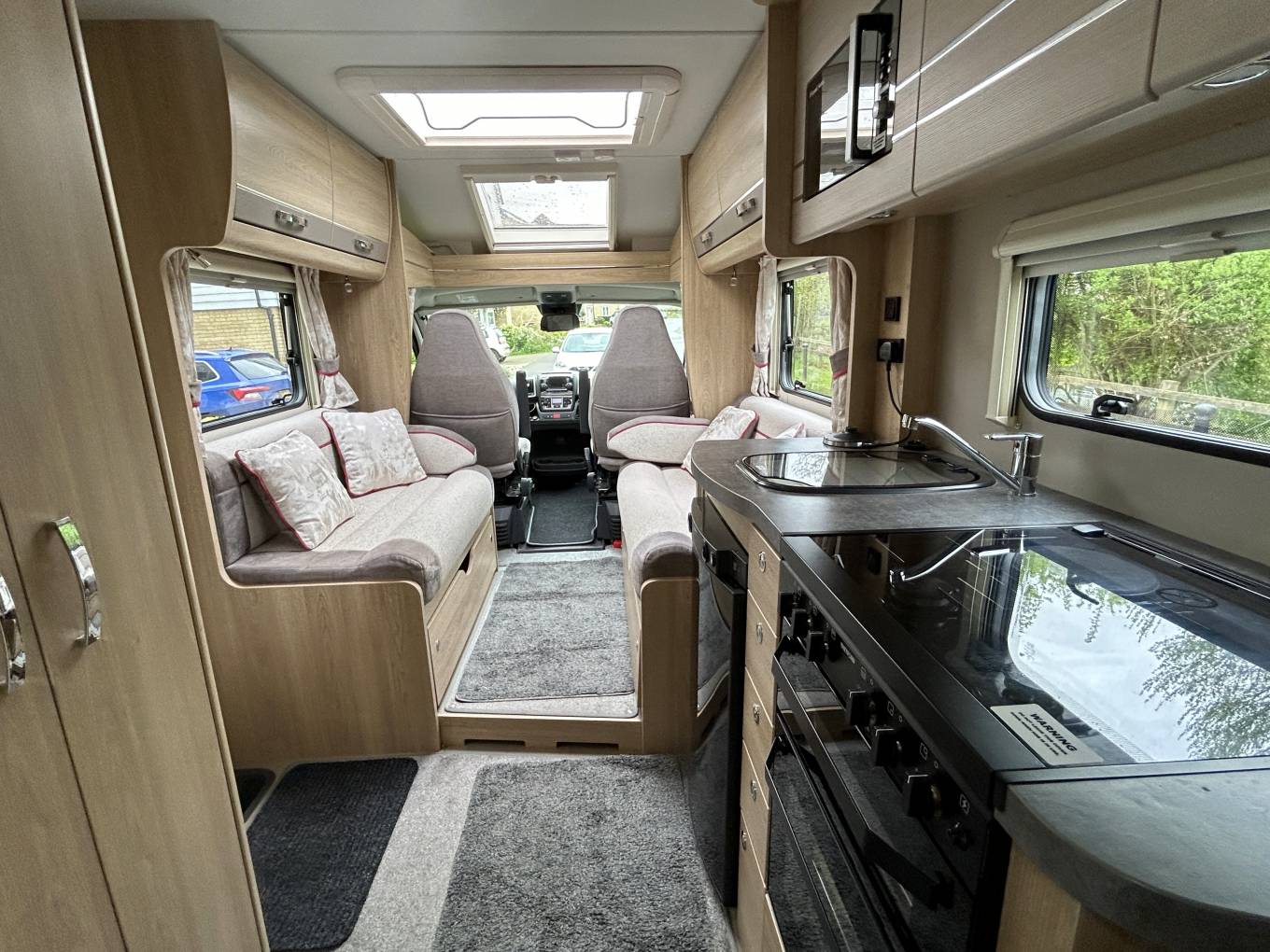 Accomplished cooks will love the kitchen. It's fitted with a gas oven and grill that has hardly been used, a dual-fuel hob with 3 gas burners and an electric hotplate, a Dometic fridge freezer, a Russell Hobbs microwave oven, a sink with mixer tap and lots of cupboard and drawer space. There is also a fold out leaf which increases the work top area for your food preparation.