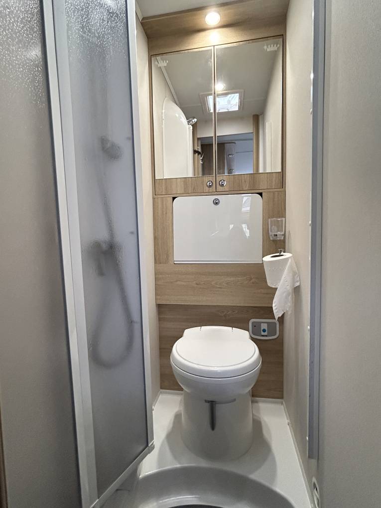 which has a shower with a perspex screen, a cassette toilet, a fold away