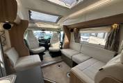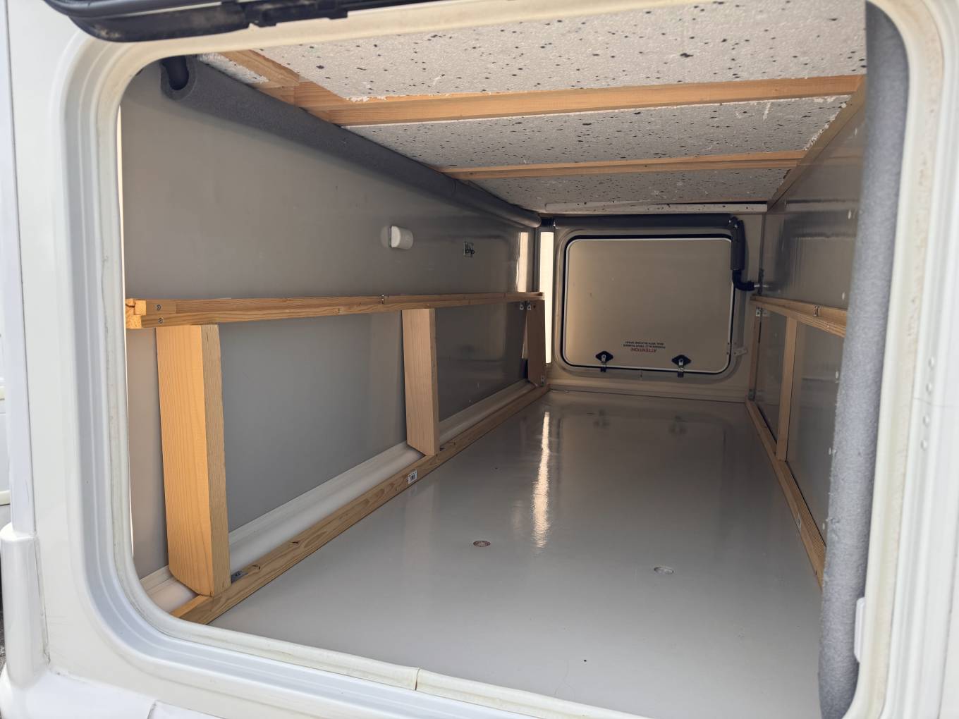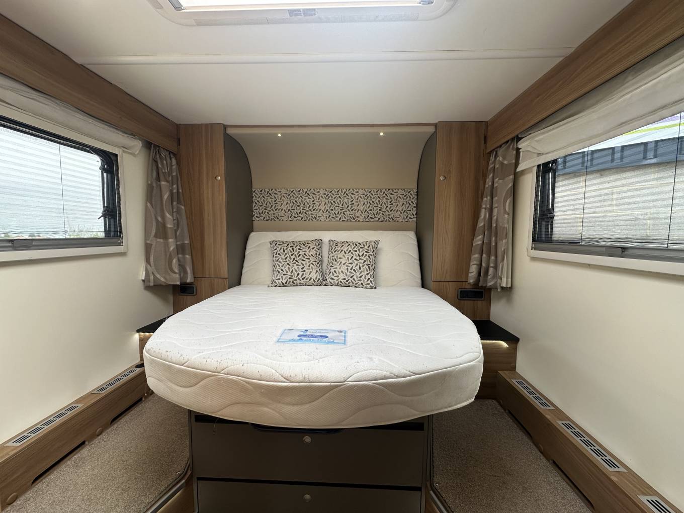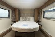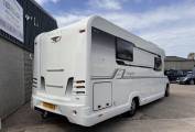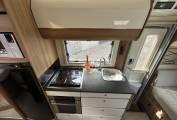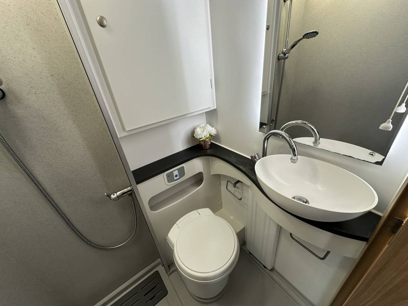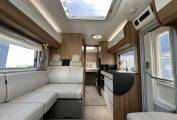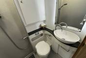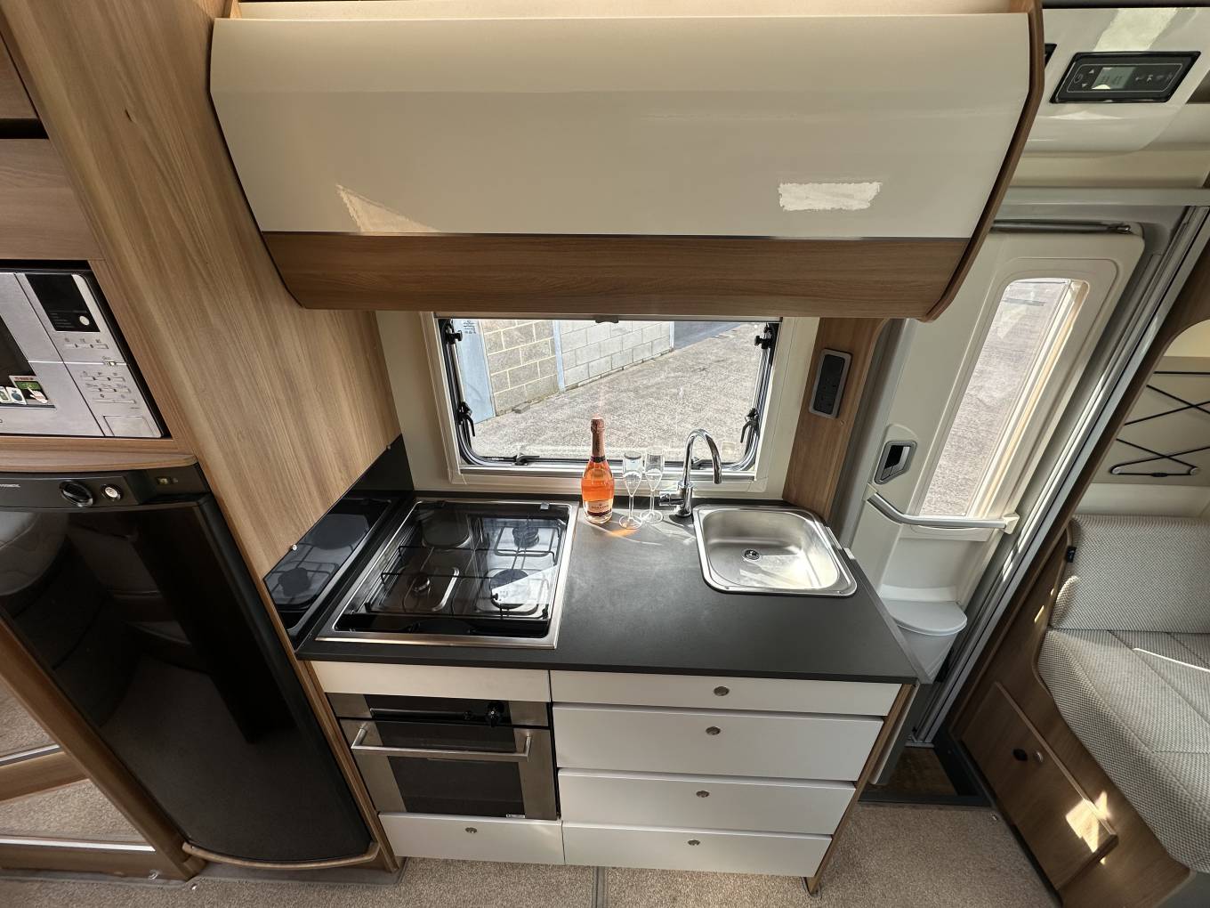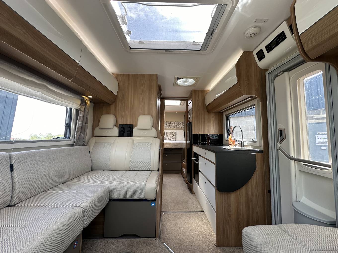 As you step into the habitation area, the lounge/dining area has an L-shaped sofa and a single seat opposite. With the two Captain’s chairs swivelled into the area, there is plenty of room for six to dine in comfort. There is also a TV in the lounge area. In the centre of the motorhome, you have the very well-appointed kitchen area complete with 3-burner gas hob with one electric plate, oven/grill, stainless steel sink with mixer tap, large 3-way fridge/freezer and a microwave. There is good work-top space for prep work and plenty of storage in the drawers and a large cupboard above. On the opposite side you have the washroom complete with separate shower unit with bi-fold door, Thetford cassette toilet with electric flush, washbasin with mixer tap and a storage cupboard. The bedroom with sliding privacy door at the rear is a lovely space with a large double island bed with easy access on both sides, large underbed drawers, a wardrobe either side of the bed and a couple of lockers. The dual fuel programmable Alde system provides heating to the radiators and hot water and there are removeable carpets fitted throughout, flyscreens and blinds on all windows and a sliding flyscreen on the habitation door.