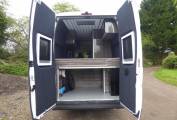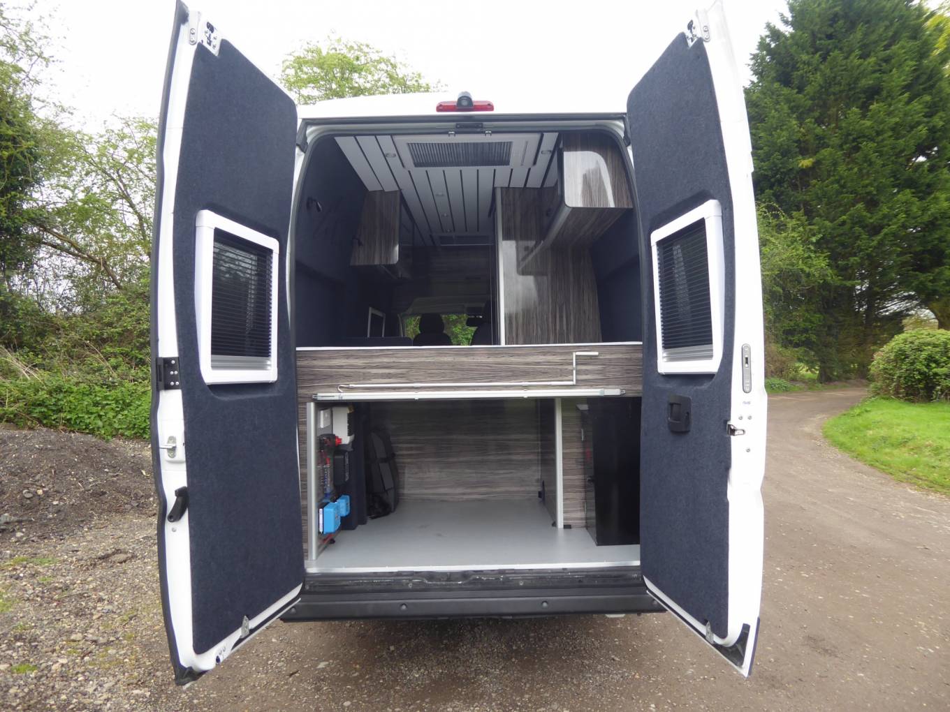 Across the rear of the habitation is a raised transverse double bed that can also be accessed by the rear doors. Under the bed is a large externally accessed storage bay.