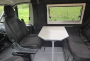 Behind the driver’s cab seat is an offside removable table and forward facing seating (with additional seat belts). This dining/leisure area can be augmented by rotating the swivel cab seats.