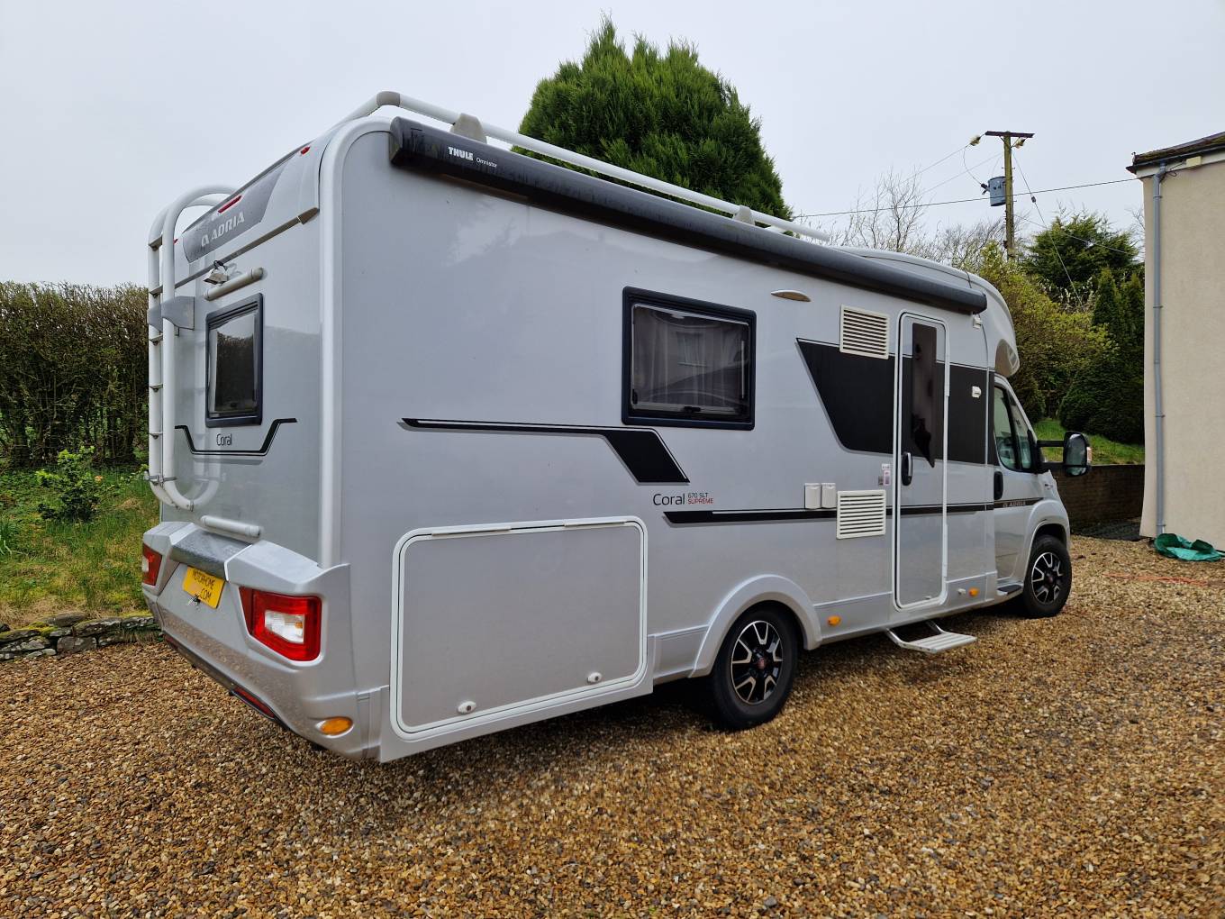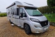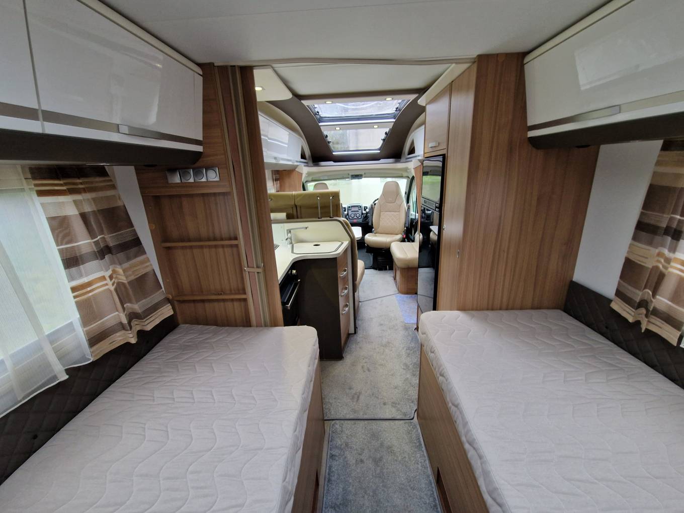 There is ample lighting throughout along with plenty of storage including a garage under the fixed beds and there are 2 gas bottles. In the cab there is AC,Fiat infotainment system,reverse sensors, electric mirrors and windows and cruise control.Overall, this is a very high spec motorhome and would be superb for a couple who want to tour in real luxury with plenty of space.