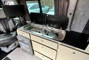 The rear bench converts quickly into a comfortable double bed, and additional storage underneath, including a wardrobe in the corner and additional storage throughout the kitchen area and back of the campervan.