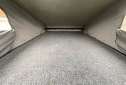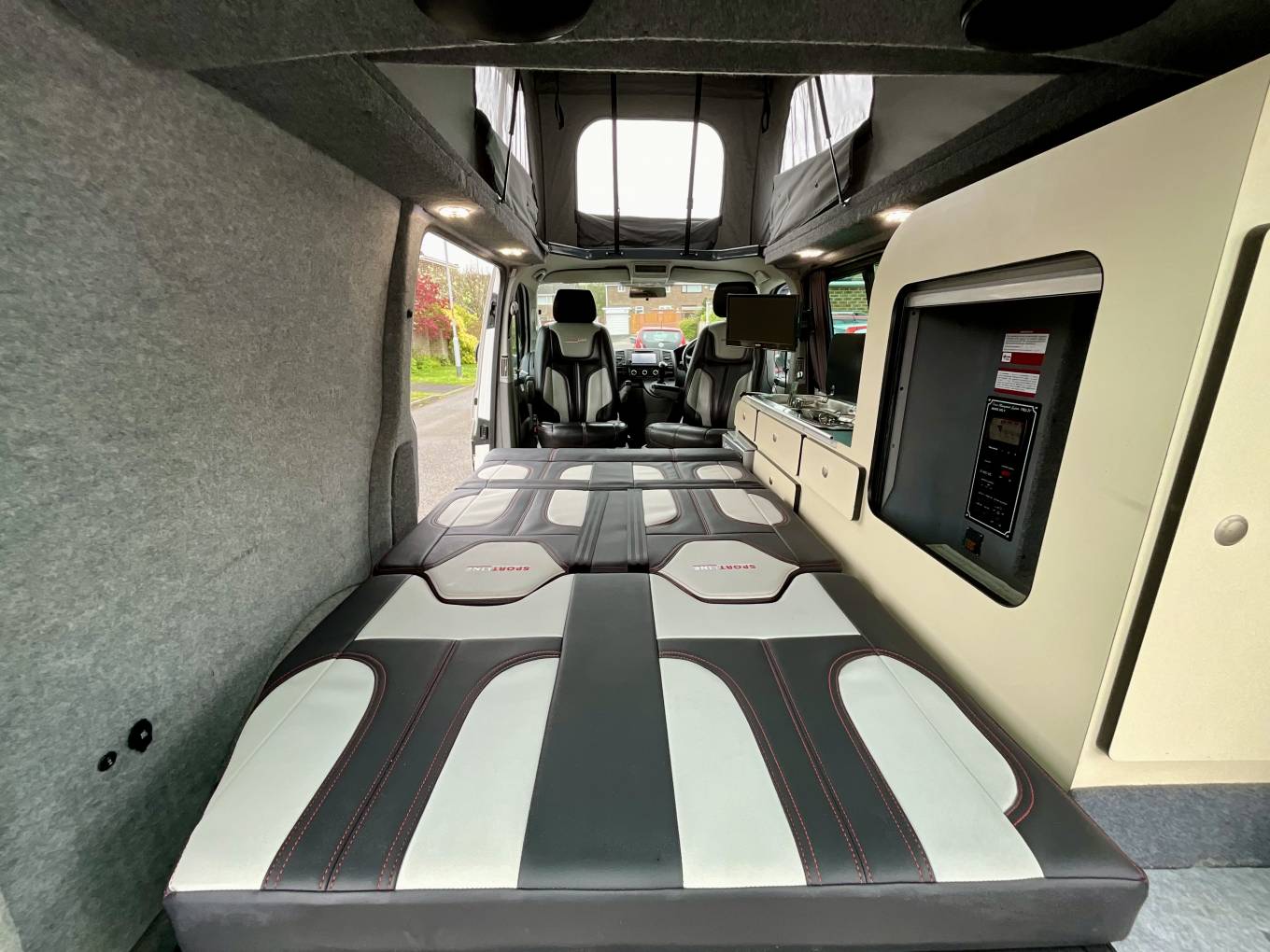 Above, a pop-top extends the space in the van and can be used for extra headroom or sleeping at night. The mesh windows can be opened to allow more natural light and a screen at the front allows for extra brightness.