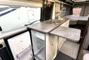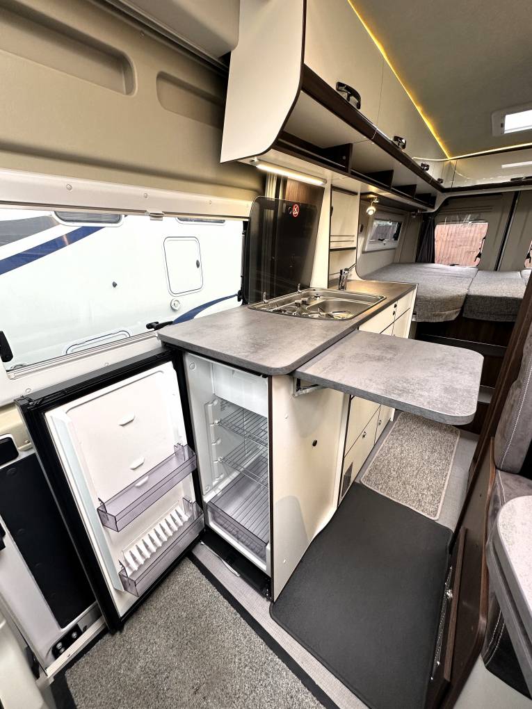 hinged fridge which can be opened from both inside and outside of the camper allowing