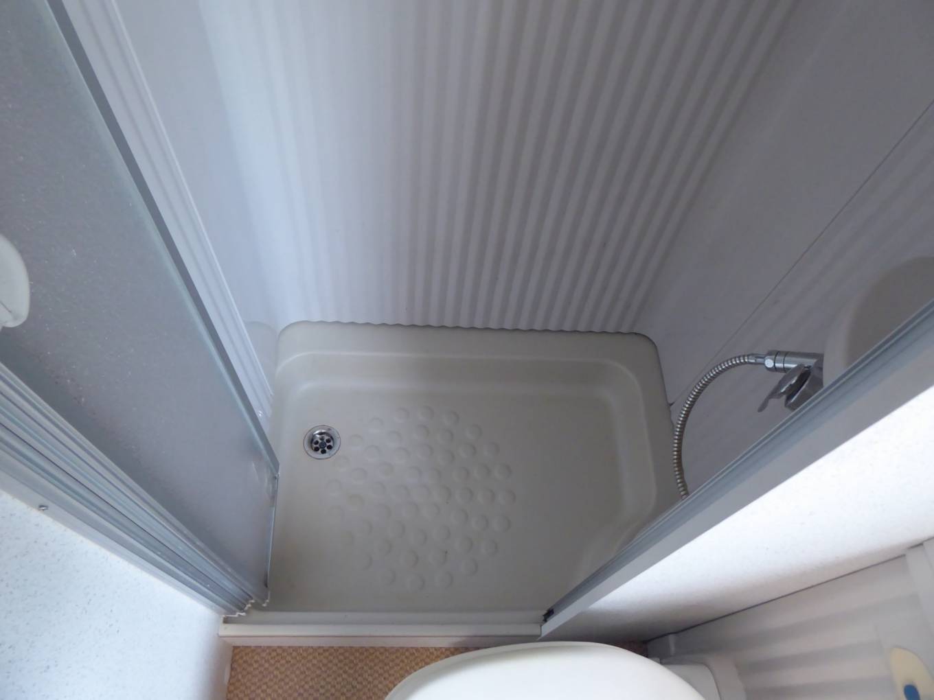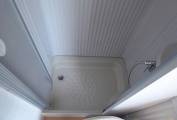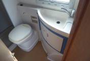 This motorhome incorporates an offside fixed rear French double bed, and a nearside rear bathroom with a toilet, a hand basin, and a screened shower cubicle.