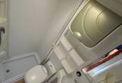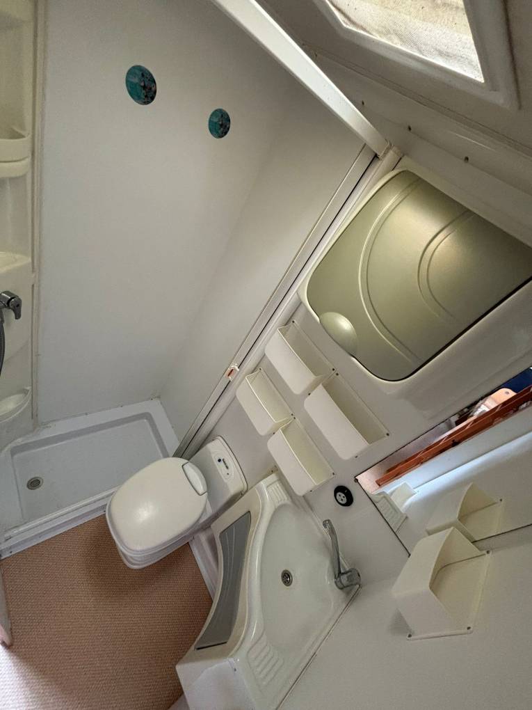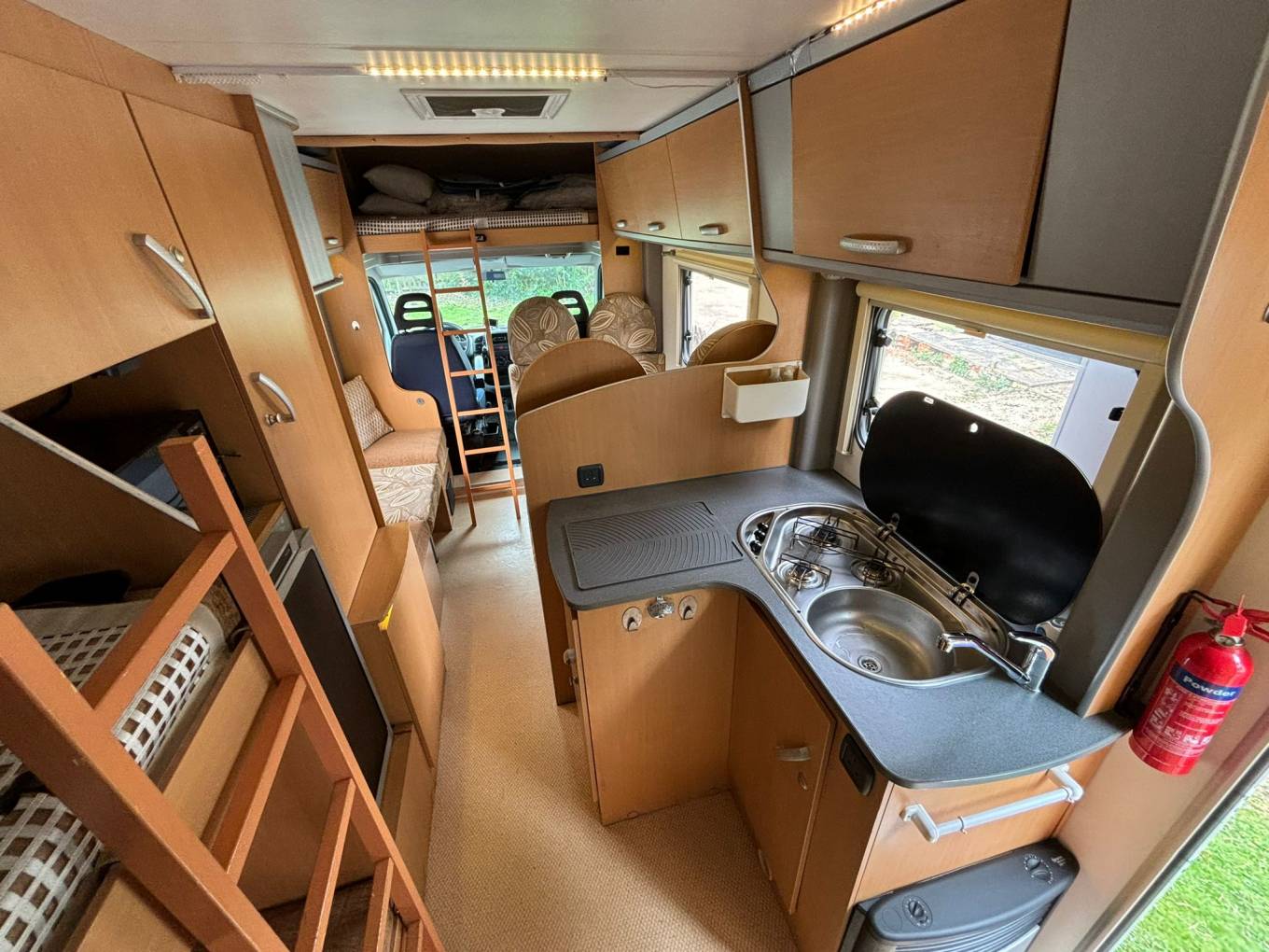 For the Layout starting at the rear as you enter the Habitation to your left is the washroom this is made up of a toilette cassette, wash basin, vanity mirror and separate shower cubicle. Just to the right of the washroom you have your first sleeping area in two single bunk beds neatly positioned against the back wall of the motorhome each bed has a window to let in plenty of light. In front of the bunks, you will find the L shaped kitchen made up of a 3-gas burner, hot and cold mixer taps, a 3-way fridge, microwave and plenty of storage space in overhead and low-level storage lockers.