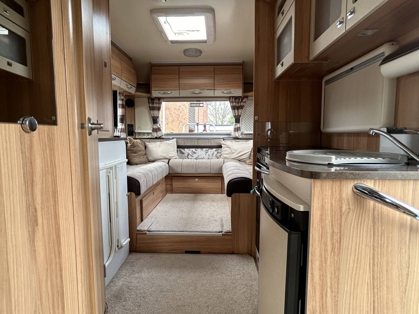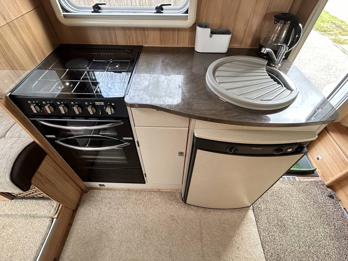 The mid-kitchen is well equipped and features a gas oven and grill, a dual-fuel hob with an electric hot plate and three gas burners plus a microwave.There is a sink with a mixer tap, a Dometic fridge and plenty of storage space for cookware and crockery. Above the kitchen is a roof mounted extractor fan to remove unwanted cooking smells.