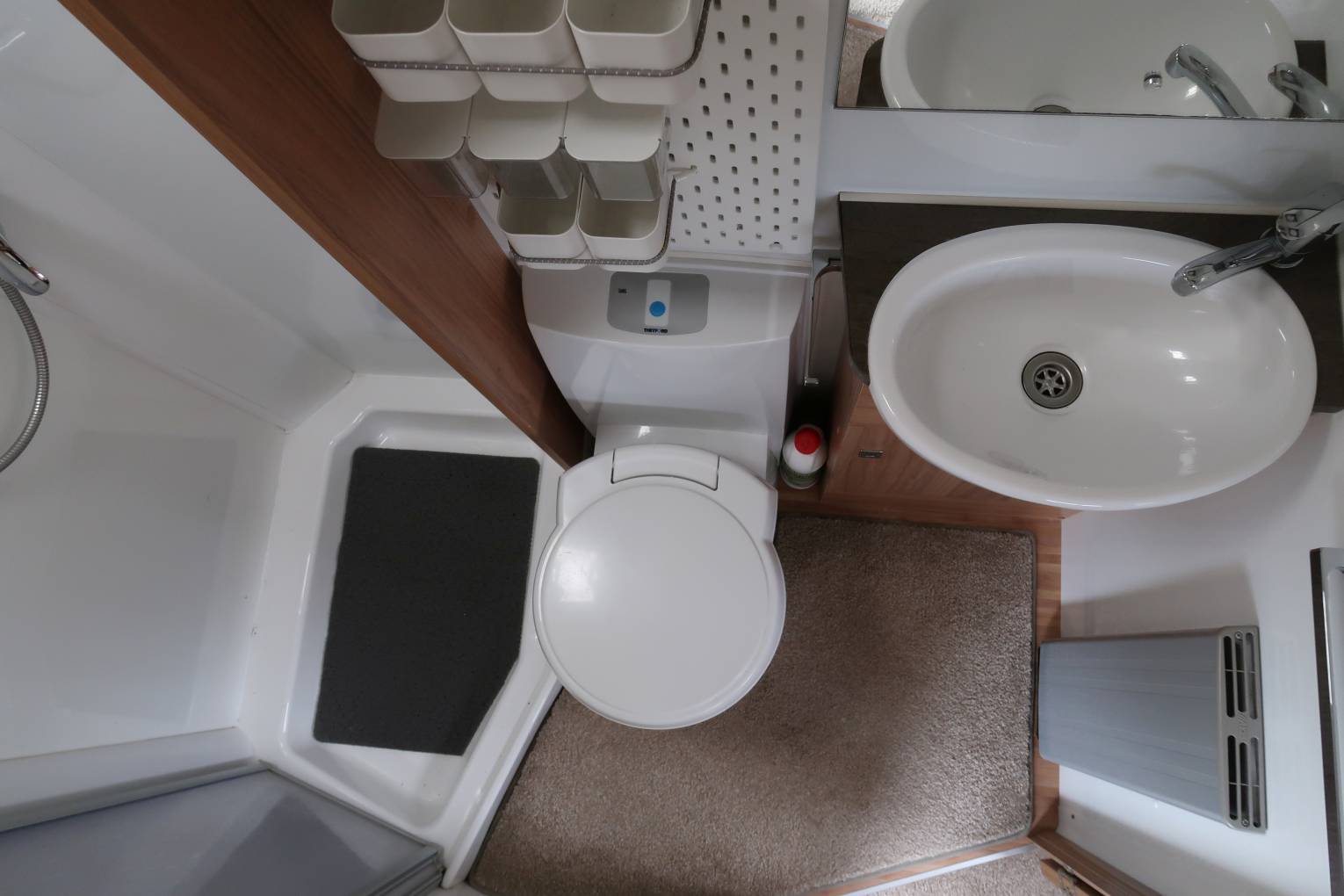 The washroom on the opposite side to the kitchen has a separate shower with perspex screen doors so you won't have to battle a soggy, cold shower curtain in the morning. There is a Thetford cassette toilet with electric flush, a wash basin and mixer tap and a large mirror.