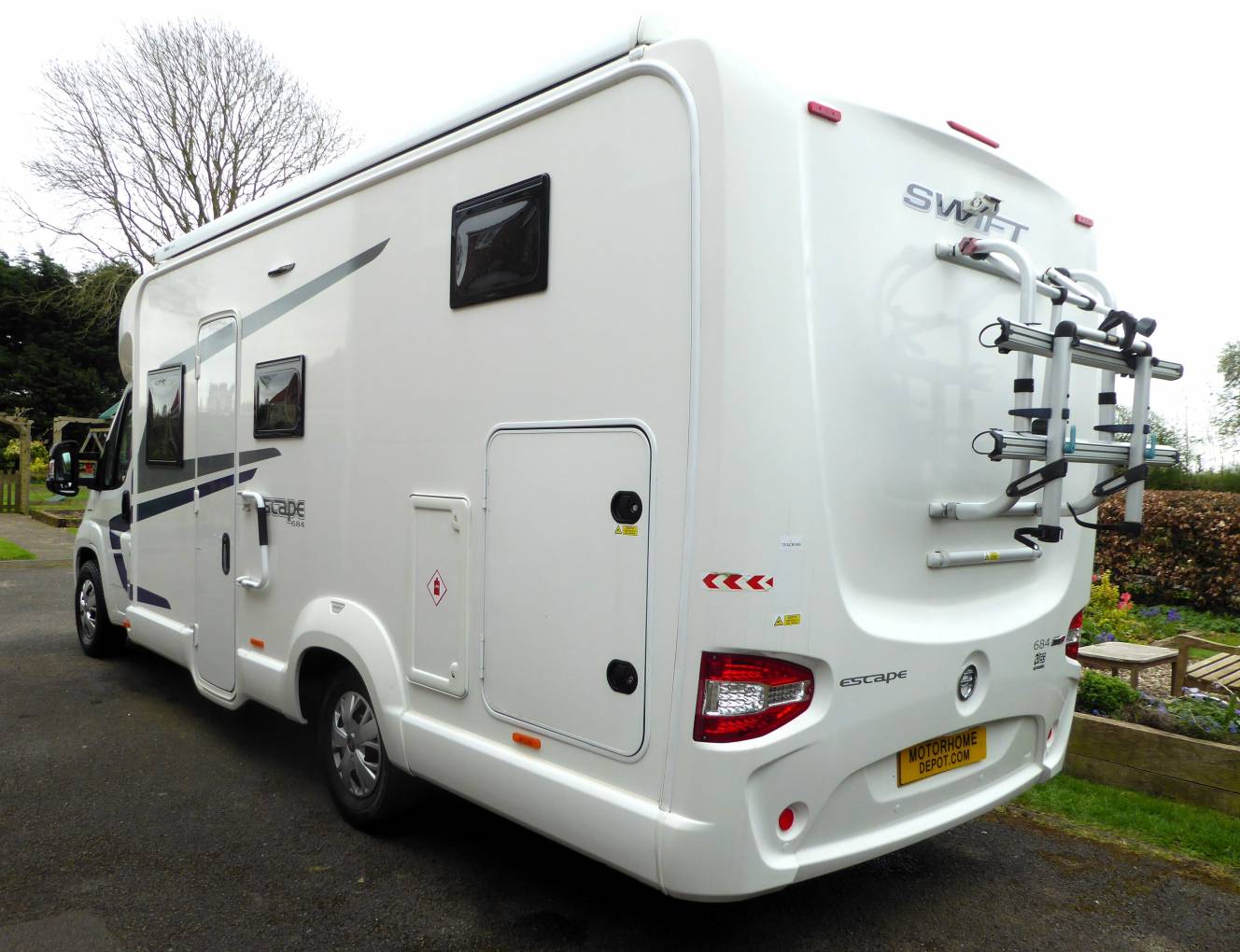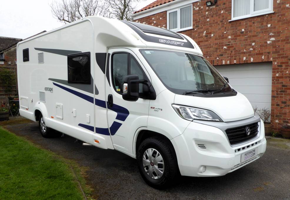Call with any questions 01423 609985. This 2018, 4 berth, low profile, Swift Escape 684, coachbuilt motorhome, has the flexibility to work well for 2 or 4 people. It is ideal for couples, with 2 single beds at the rear, which can be made into a large double, above the garage or using the sofa and dinette at the front, 4 people can sleep in comfort. There is a washroom, with toilet, sink and shower attachment. In the kitchen, is a 3 gas burner hob, sink, and tall fridge freezer with pop up worktop by the habitation door, which also has a flyscreen. The front lounge has a L shape sofa with 2 full seat belts and a sofa on the nearside. There are 2 captains’ seats in the cab, which also has automatic gearbox, cruise control and rear view camera. Additional features include, solar panel and canopy. It has travelled 10,011 miles and is up to date for habitation and service with MOT to October 2024. Viewing by appointment only near Easingwold, North Yorkshire. Part Exchanges welcomed on this vehicle, for further information and photos, please call us on 01423 609985 quoting reference 238178