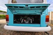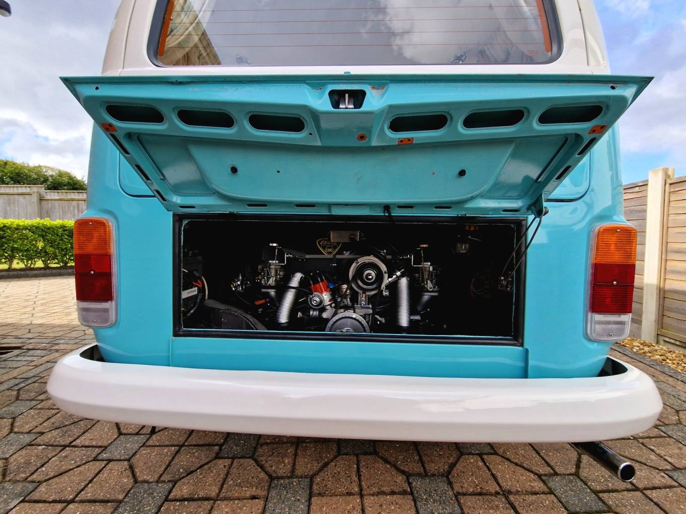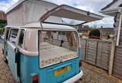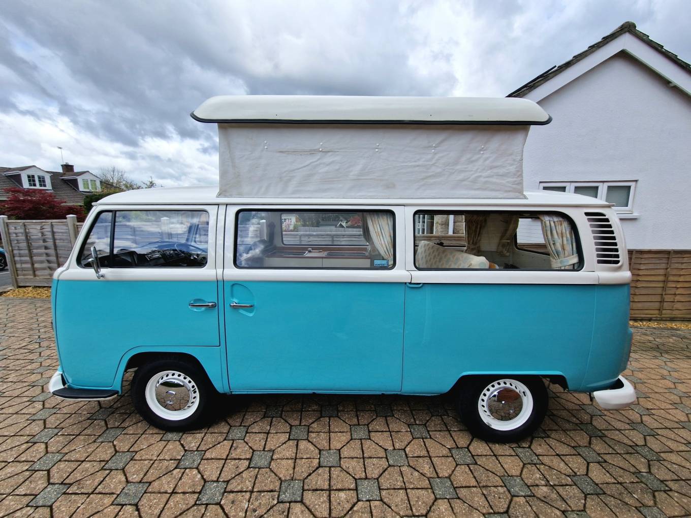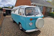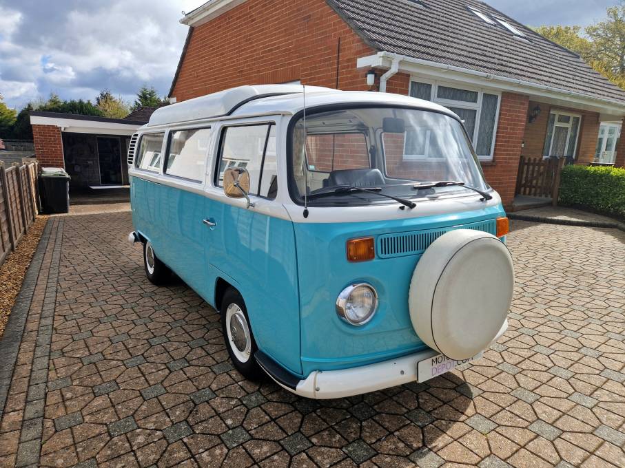 Made in 1972 and re-sprayed from yellow and white to blue and white, this Bay window VW T2 is complete with a rear engine, pop-top, power steering and servo assisted brakes.