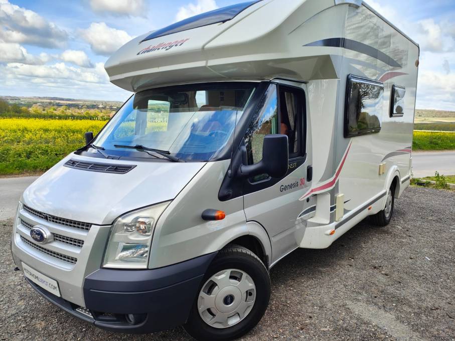 This is a great example of the compact 4 berth, 4 seatbelt Challenger Genesis 30. This sub 6 metre coachbuilt features a fantastic drop down bed above the dinette with a spacious rear bathroom with separate shower. This LEFT HAND DRIVE motorhome is plated at 3500kgs so can be driven by all and having covered only 35k kms or 22k miles from new with full service history, she is ready for new European adventures. Recently serviced in April 24. Based on the excellent Ford Transit cab, this 2.0 tdci has the desirable cab aircon and a 6 speed manual gearbox. This lovely example includes solar panel, reverse camera, awning, cycle rack, back box and a towbar. Based in Kent and more pictures available.