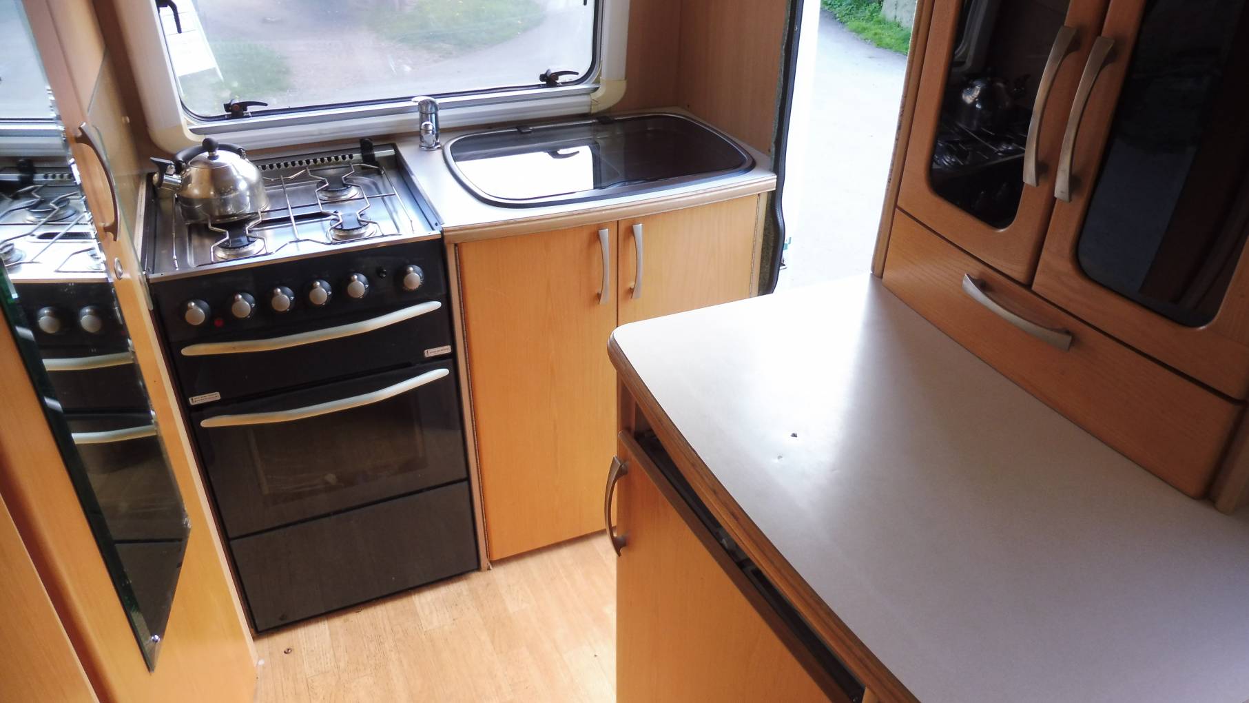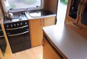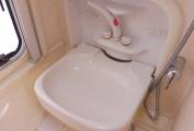 As you enter through the habitation door, the kitchen is immediately on your right, this is built up of a 4-gas burner, large sink with mixer taps, full oven with separate grill and a 3-way fridge. The washroom is located to the left of the kitchen and has a good-sized shower tray, a Thetford cassette toilet, a fold-down washbasin with mixer tap, a separate tap for the shower handset that mounts on a rising rail and vanity mirror.
