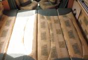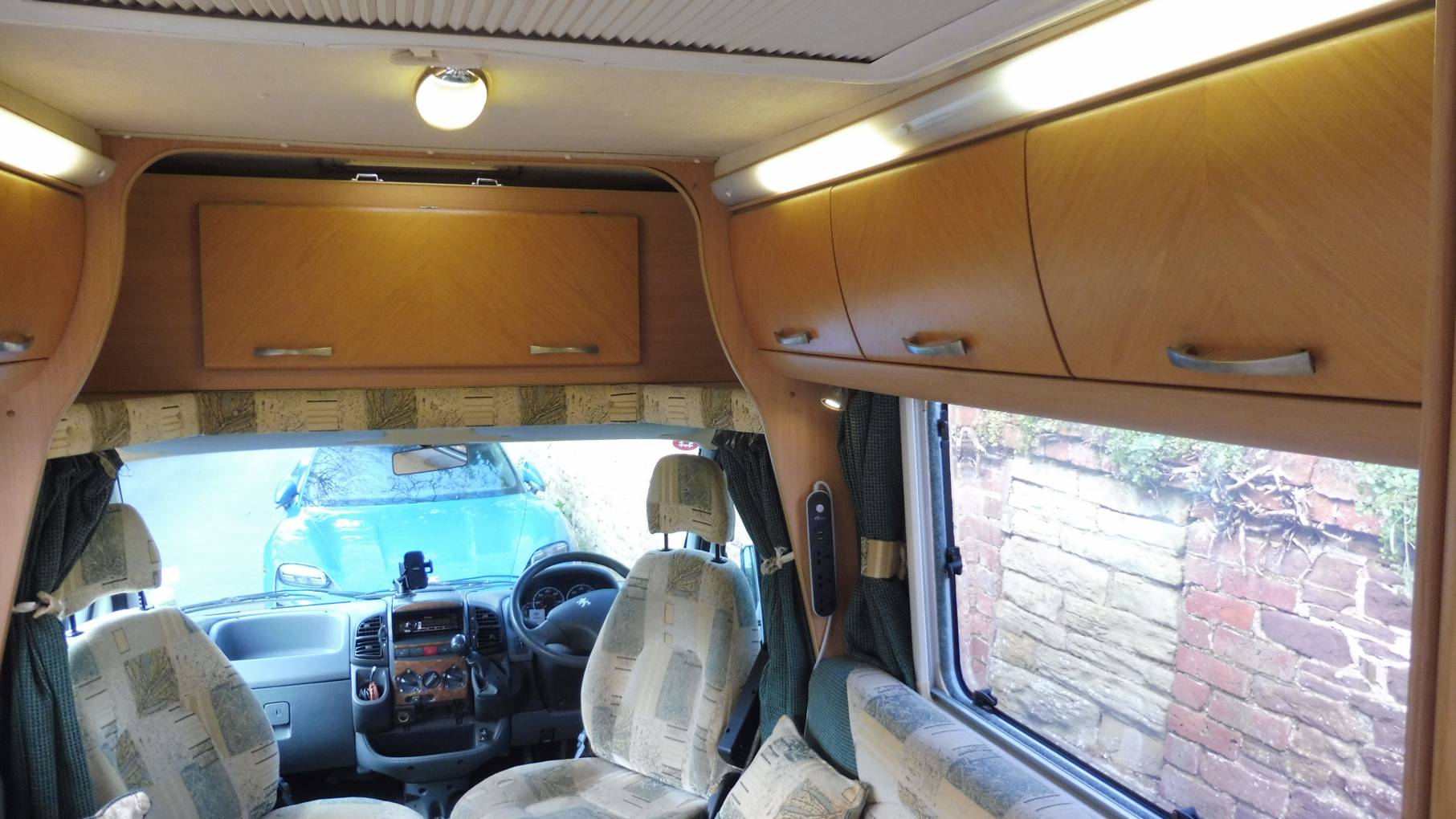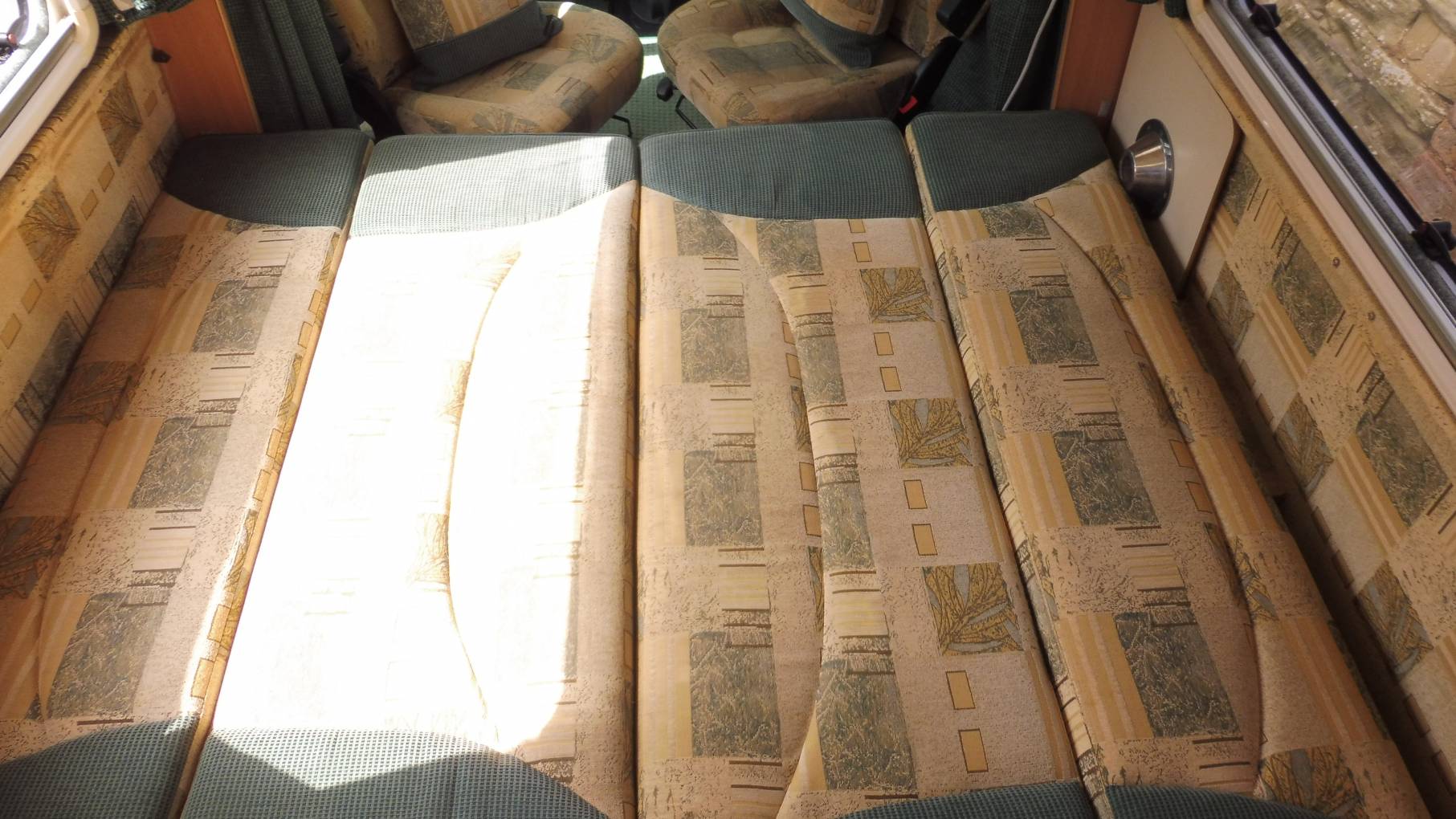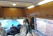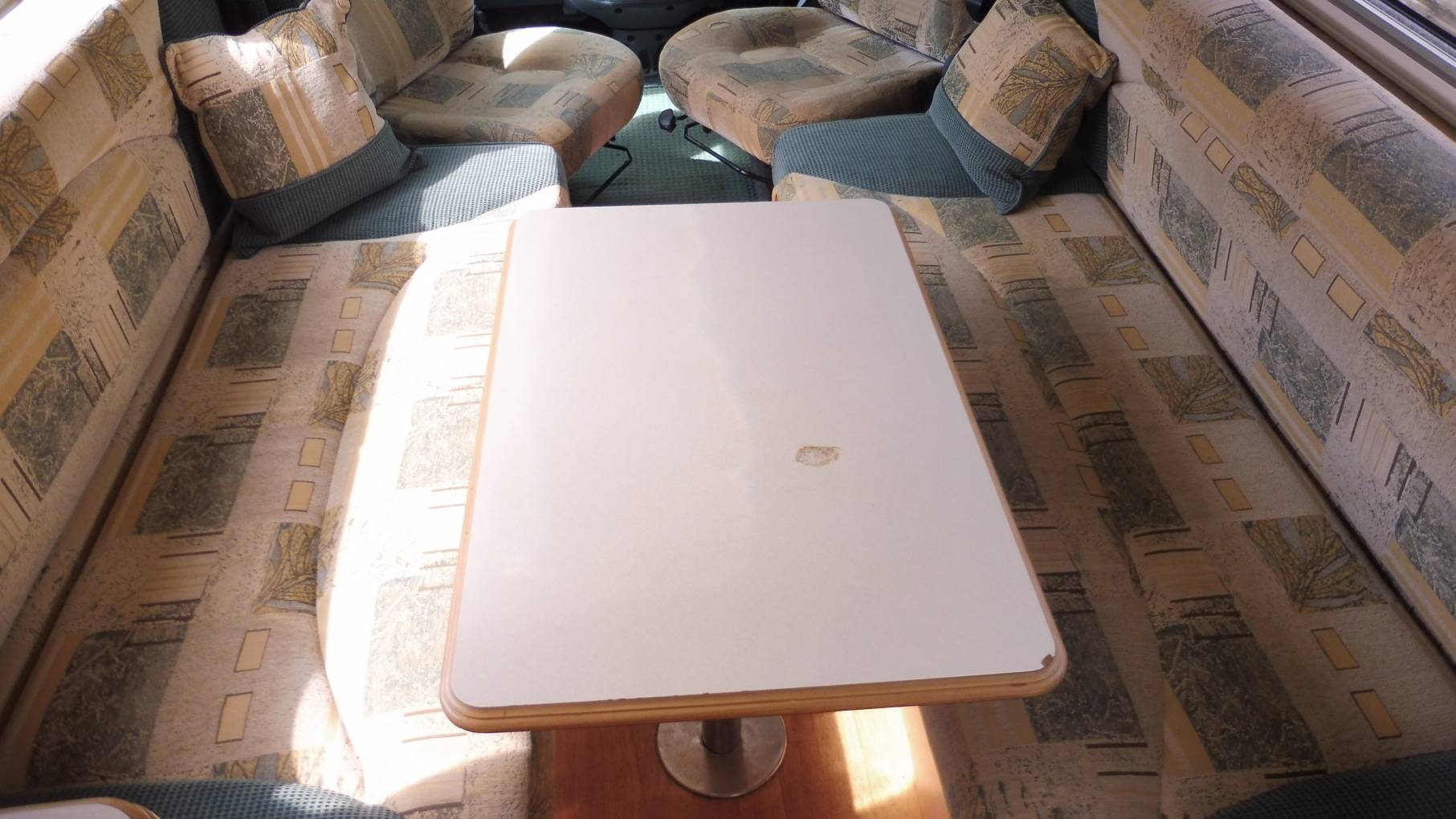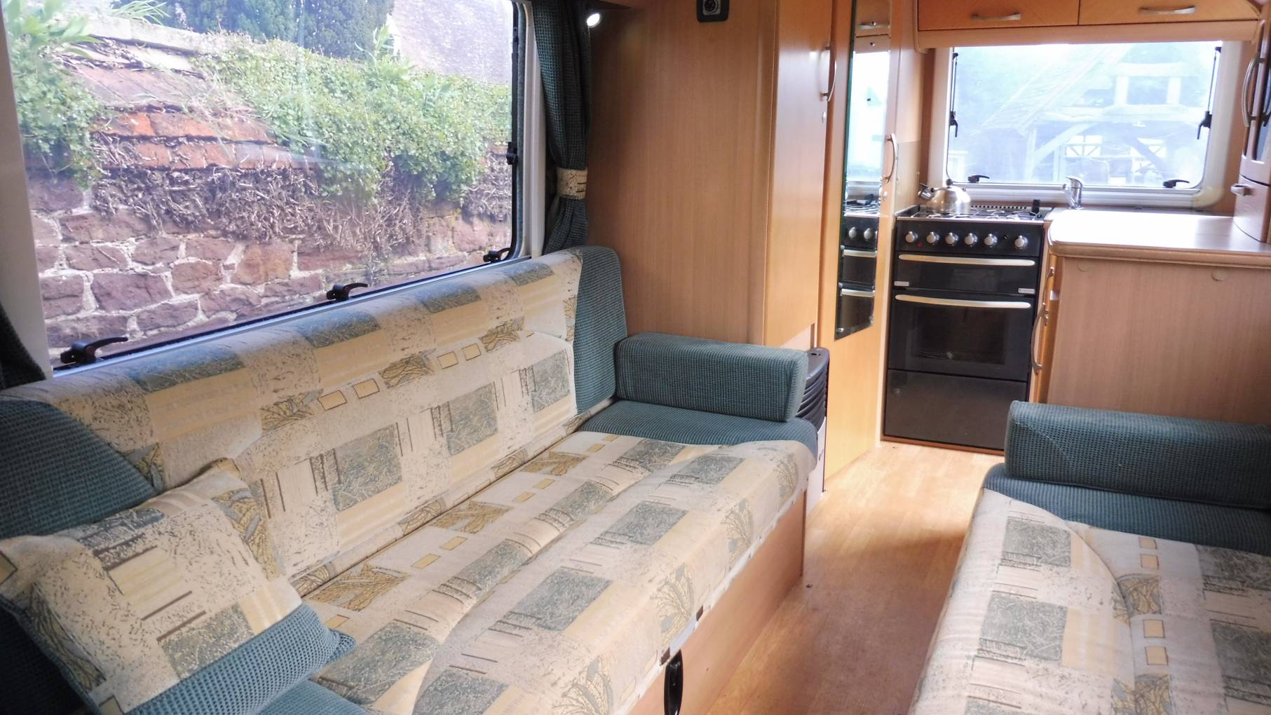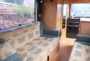 The lounge area has two parallel sofas that pull together to make up a very large double bed or, in conjunction with the front seats, could be used as singles. Two dining tables, one large and one small have chrome poles that fit into the floor. Under the sofas you have additional storage. There is a small overcab bed whcih would be suitable for children, or as the current owners for more storage.