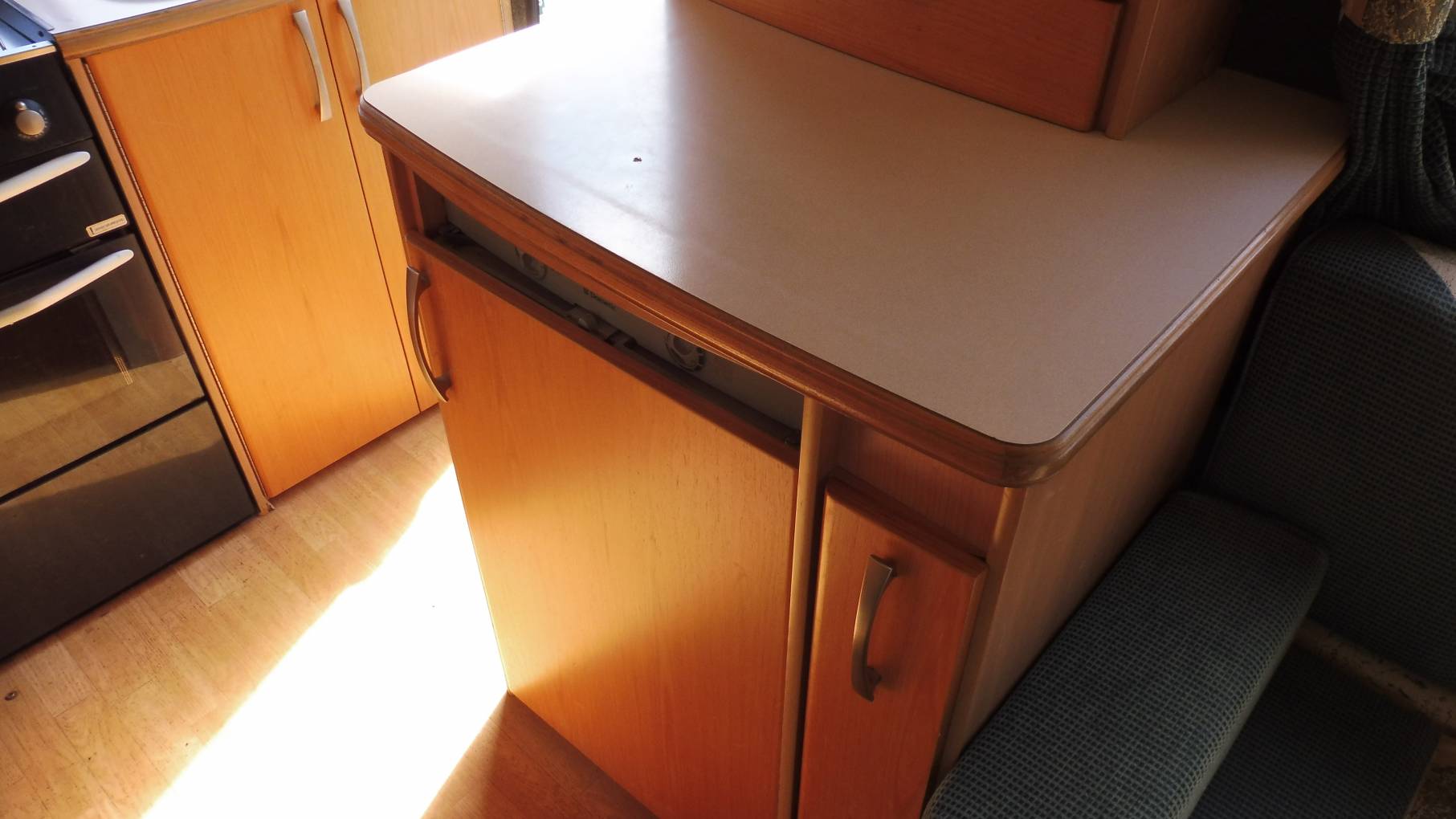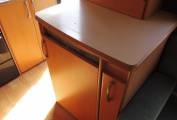 Next to the washroom is a large wardrobe with hanging rail and a shelf above, below the wardrobe is the gas fire. opposite there is a tall dresser style unit that has the fridge below, a countertop with drinks cabinet above. Upper lockers are situated all along the top of the motorhome and across the bottom to give you ample storage space.