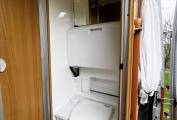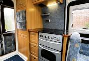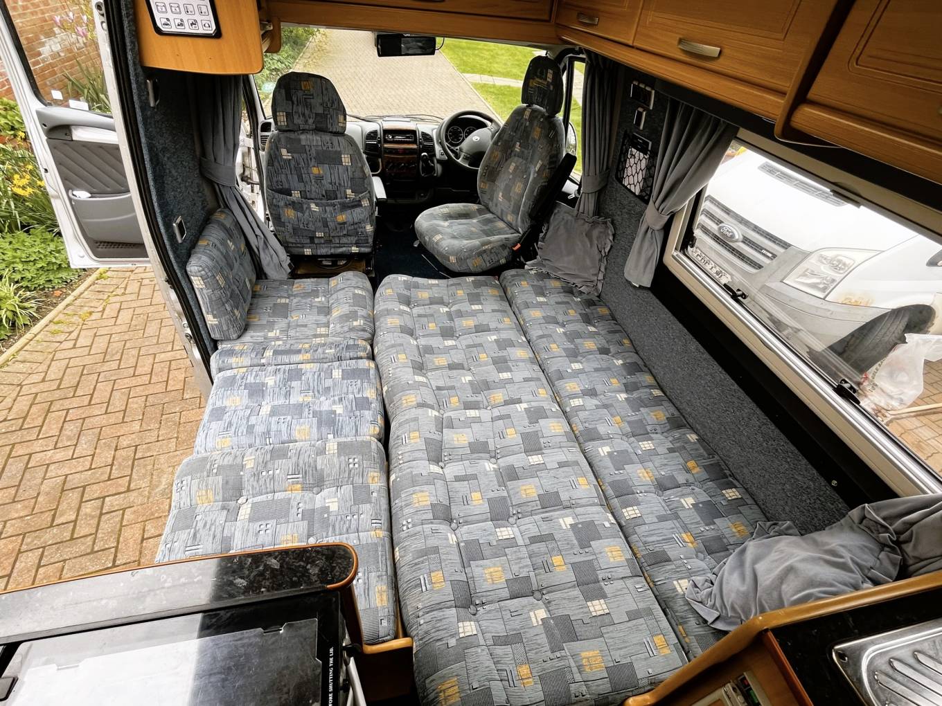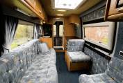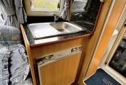There are three travel belts and the large lounge area with long side sofa and two cushioned chairs, converts swiftly to a huge double bed that can accomodate two adults and a child. The bed can be set up in a couple of different configurations. An occassional table provides space for dining and entertaining. A well specified Kitchen provides a 4 gas burner hob above a separate oven and grill. Opposite is a sink with mixer tap and good sized under counter 3 way fridge with small freezer box. There is storage to the side of the oven and overhead lockers with work surface and a storable sink cover that provides additional preparation area. To the rear is home from home comfort with a private washroom comprising flushable cassette toilet, drop down sink with mixer tap and shower. A good sized wardrobe features too.