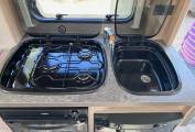 the kitchen , containing a Thetford gas oven with 3 hobs and grill, sink,