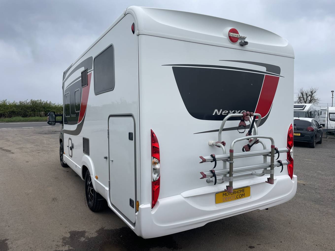 Motorhome Depot Retail Site near Farnsfield present this stunning Burstner Nexxo Sovereign T690G. The stylish Nexxo T690G layout comprises of a forward dinette with leather upholstery and swivel cab seats, this acn be made up for a cosey double bed at night, centre kitchen with gas hob, oven, grill and large fridge freezer, washroom with shower cubicle, vanity sink and toilet, plus a rear bedroom area featuring twin single beds, which can become a large double, with memory foam mattresses over a generous rear garage with twin access doors. This motorhome is capable of use for extended trips away, thanks to the excellent specification, quality fixtures and fittings.