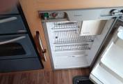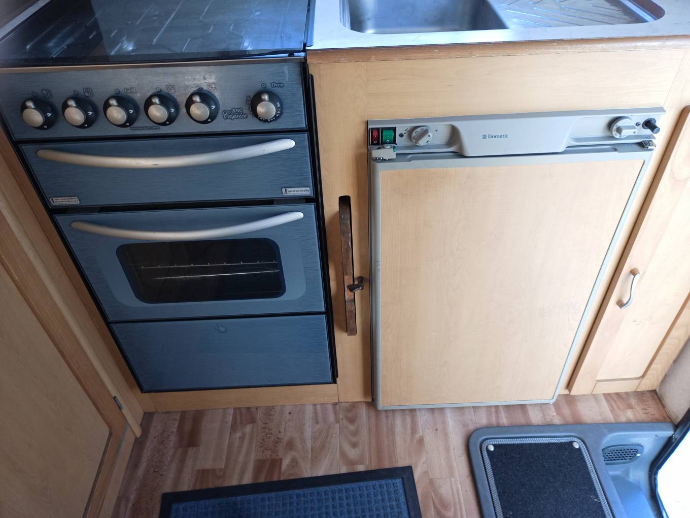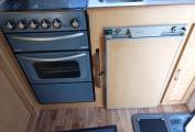 With a long sofa, a dinette that converts to a double and an overcab bed this is a rarely found layout. Complemented by a washroom and kitchen to the rear. The washroom has a shower, basin and pedestal loo. The kitchen offers a four burner gas hob and oven and grill.