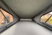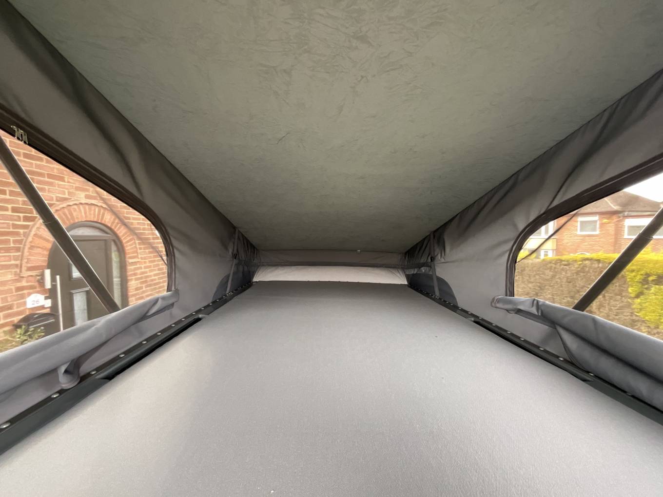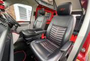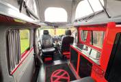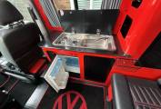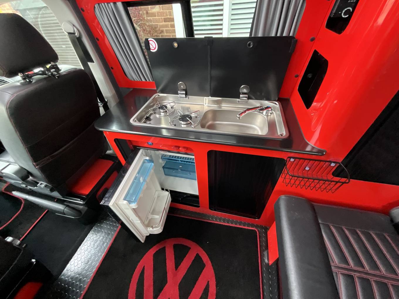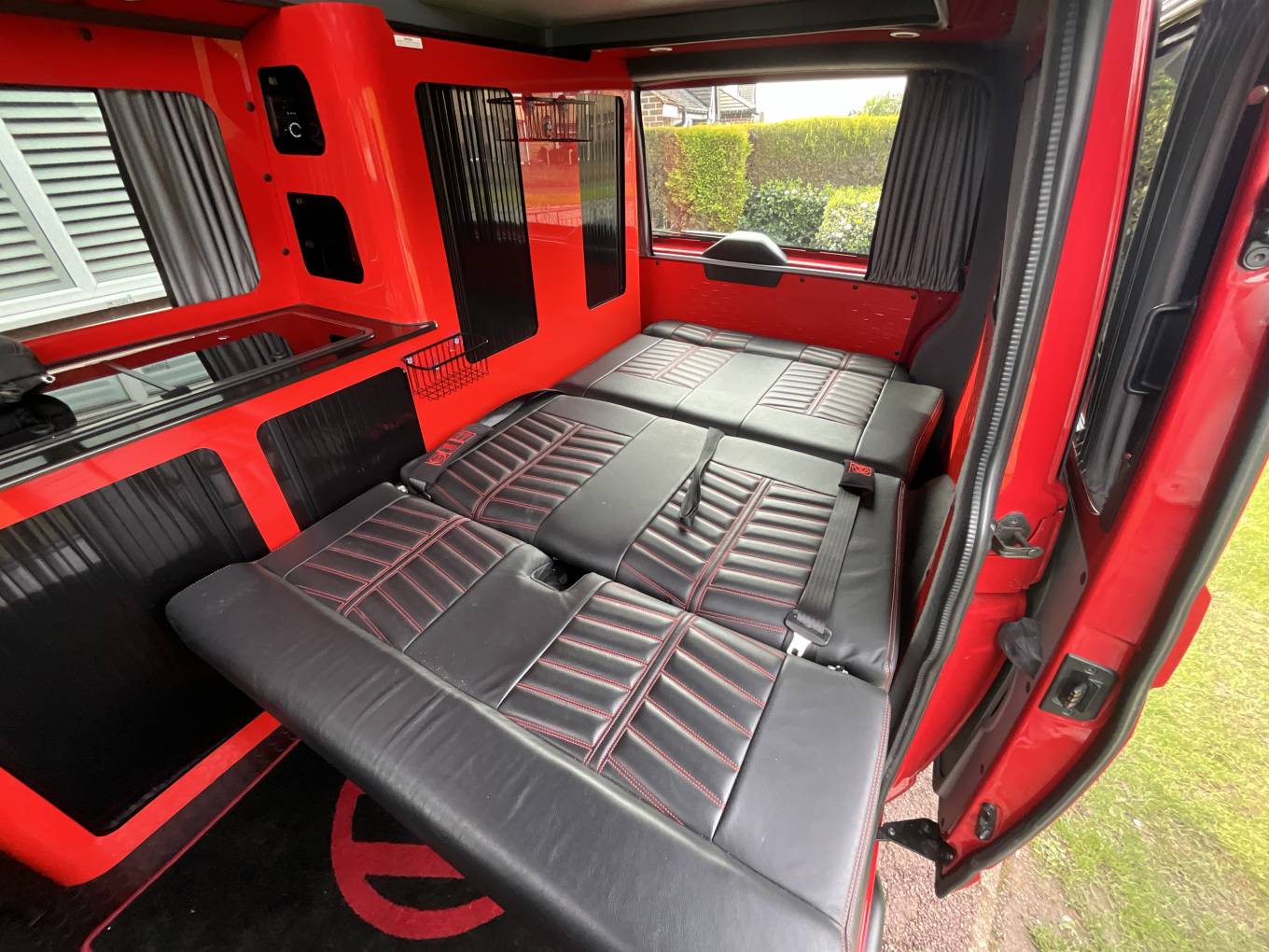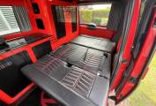 The interior walls feature bespoke moulded panels, again in high gloss red, and the upholstery is finished in black with contrasting red stitching. he rear bench seat features two seat belts and converts to a small double sleeping area. The pop top is home to another double sized sleeping area and is finished in a suede effect finish and has a foam mattress.