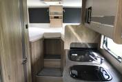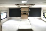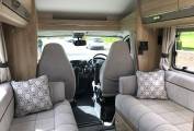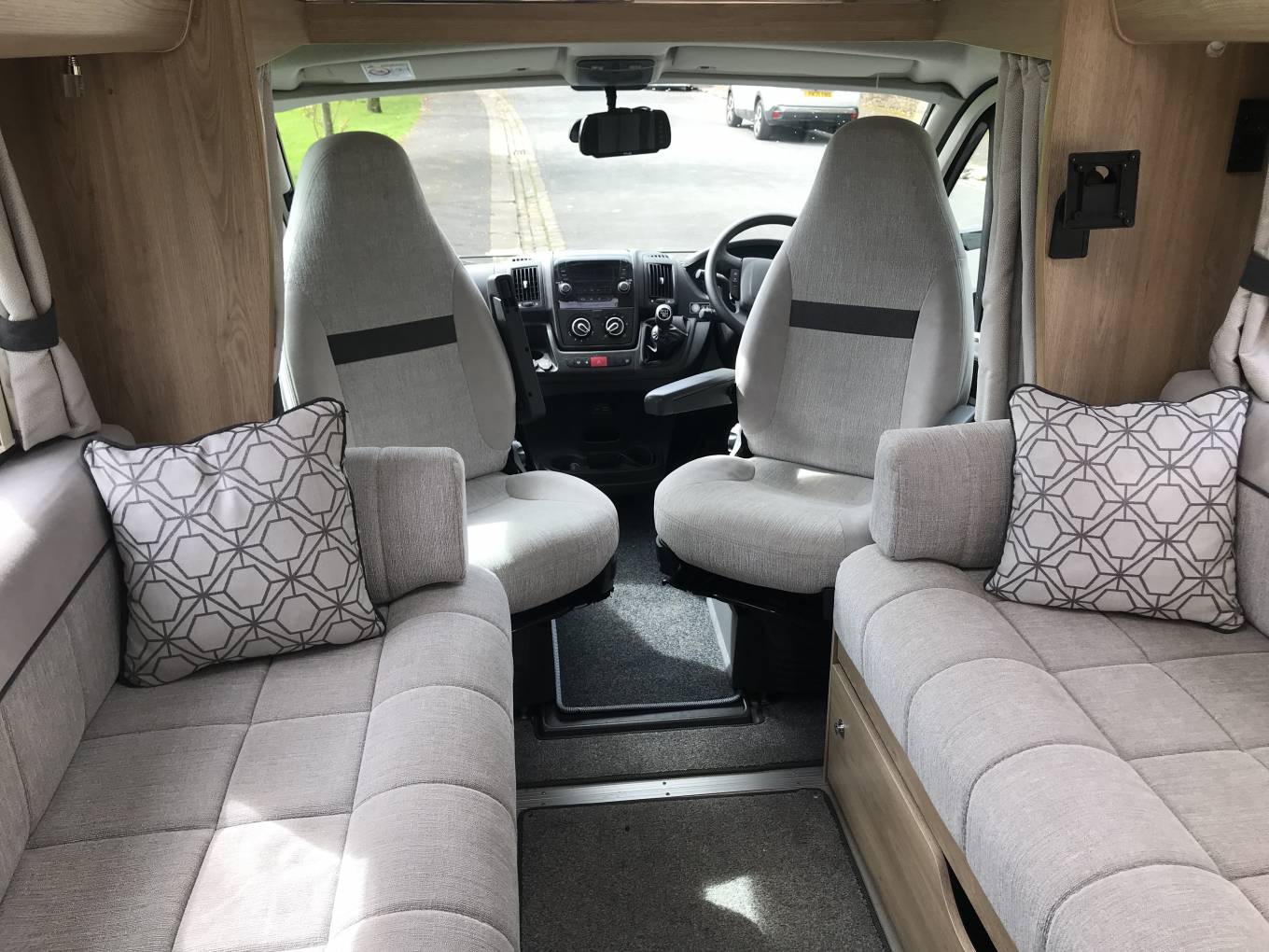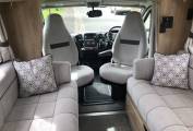 At the front there is a lovely open Lounge area with 2 opposite facing bench seat that in conjunction with the 2 swivelling cab seats make a very social space for family and friends comfortably seating 6 people.