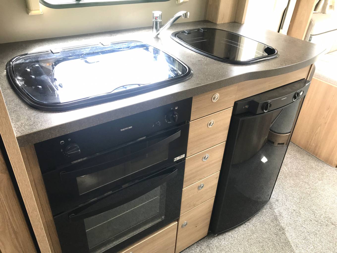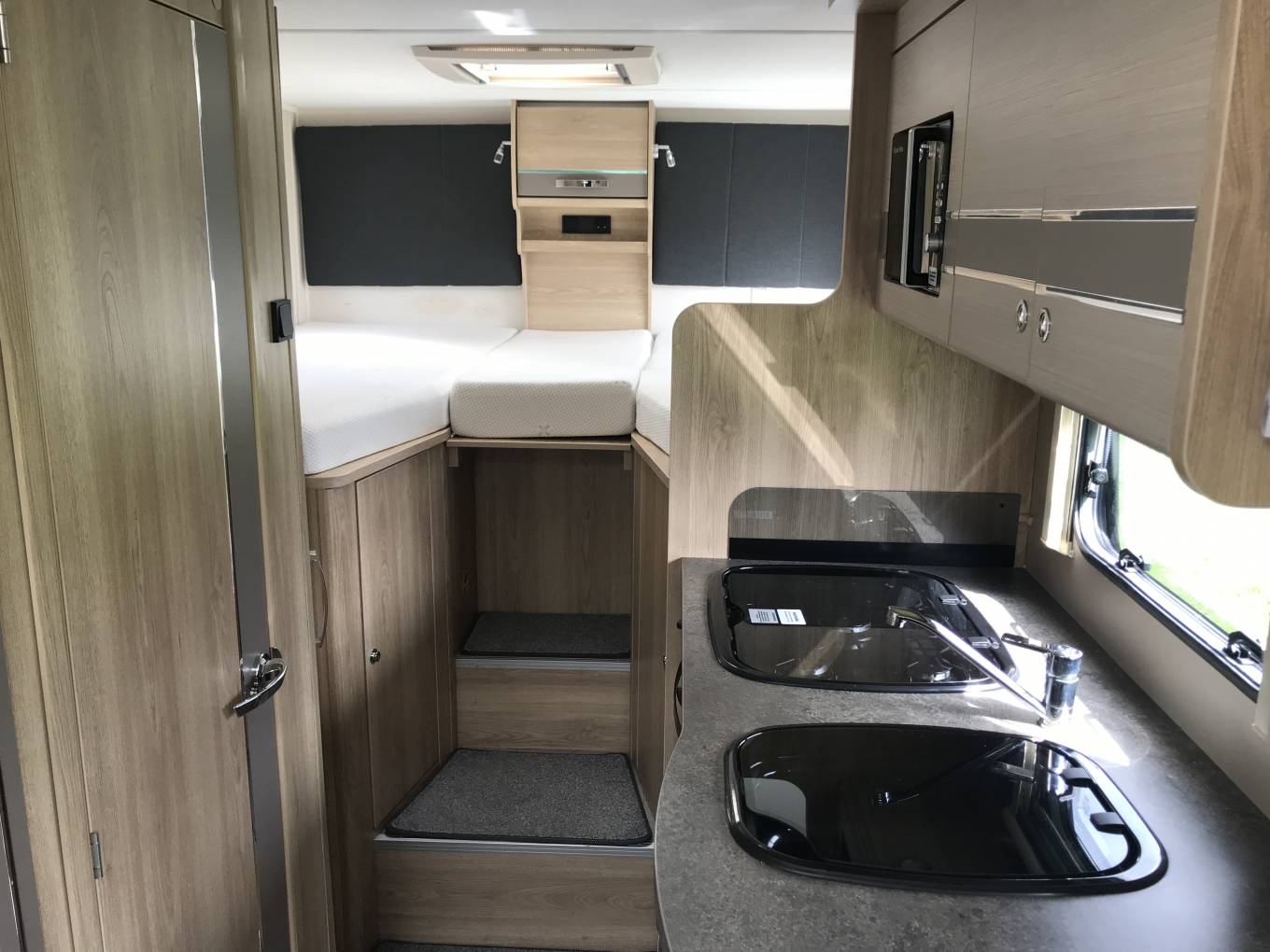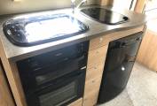 The Galley kitchen Includes a 3 ring gas hob, sink, fridge and microwave plus a useful pop up worktop extension on the end.