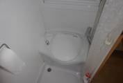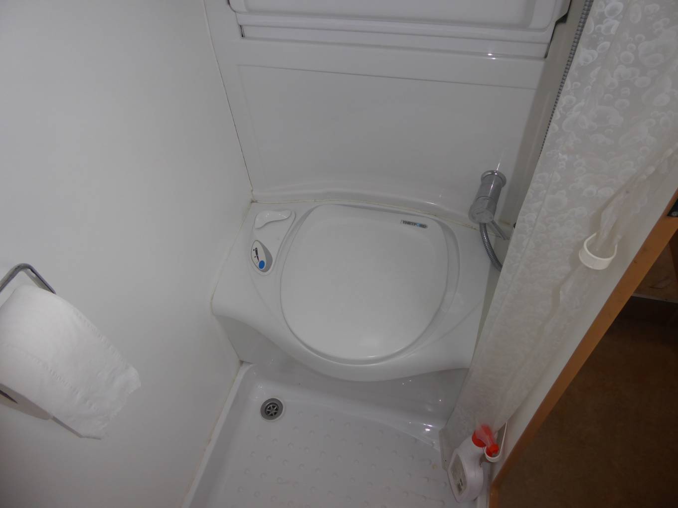 Opposite there is a fridge with a freezer box below a storage cupboard, and the wet room which has a toilet, a hand basin, and a shower.