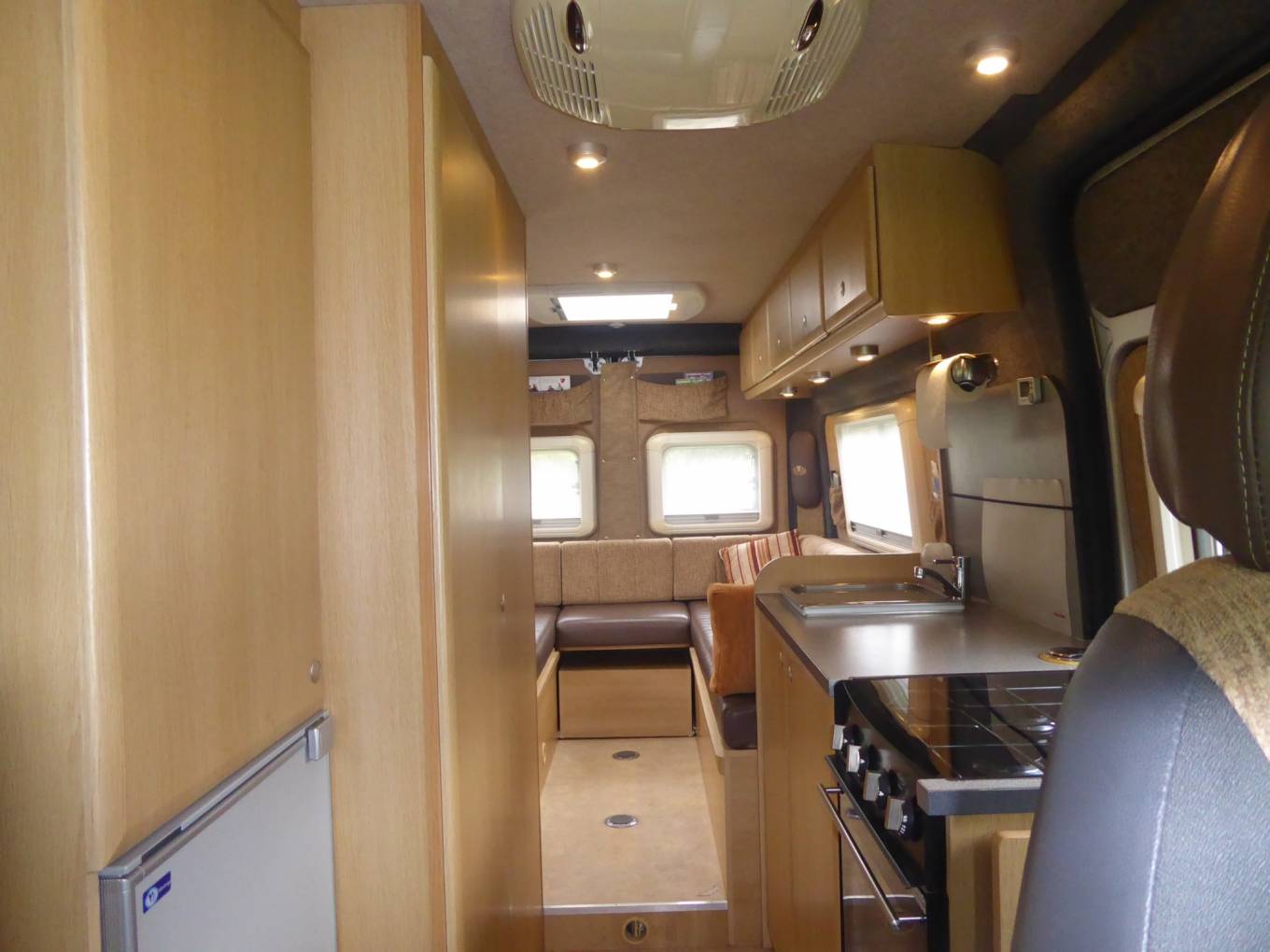 In the centre of the camper, beside the side door, is the nearside kitchen which has a hob with 3 gas burners, a combination gas oven/grill, and a sink.